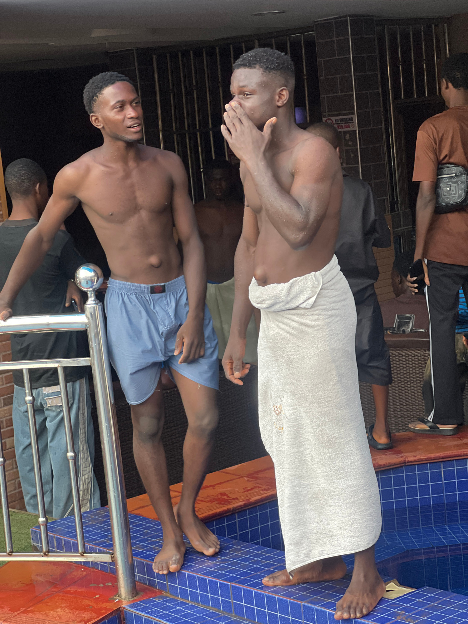 The image depicts a group of men near a pool in what appears to be an outdoor setting, potentially in Obosi, Nigeria, based on the question's prompt. One man is wearing blue shorts, another is wrappedβ¦read more