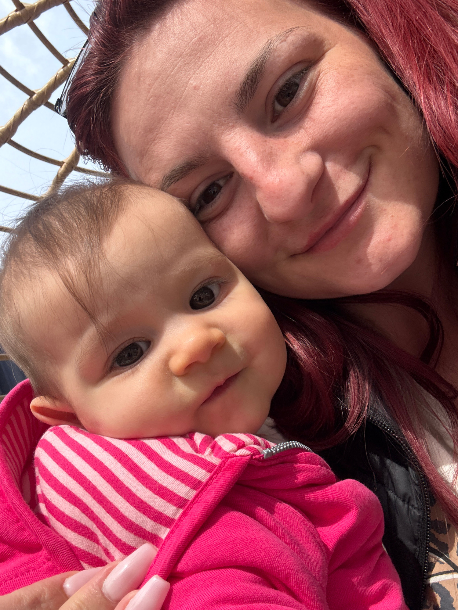 A selfie of a Caucasian woman with auburn hair and a baby wearing a pink striped jacket. The woman has brown eyes and a neutral expression, while the baby has brown eyes and is slightly smiling. Theyβ¦read more