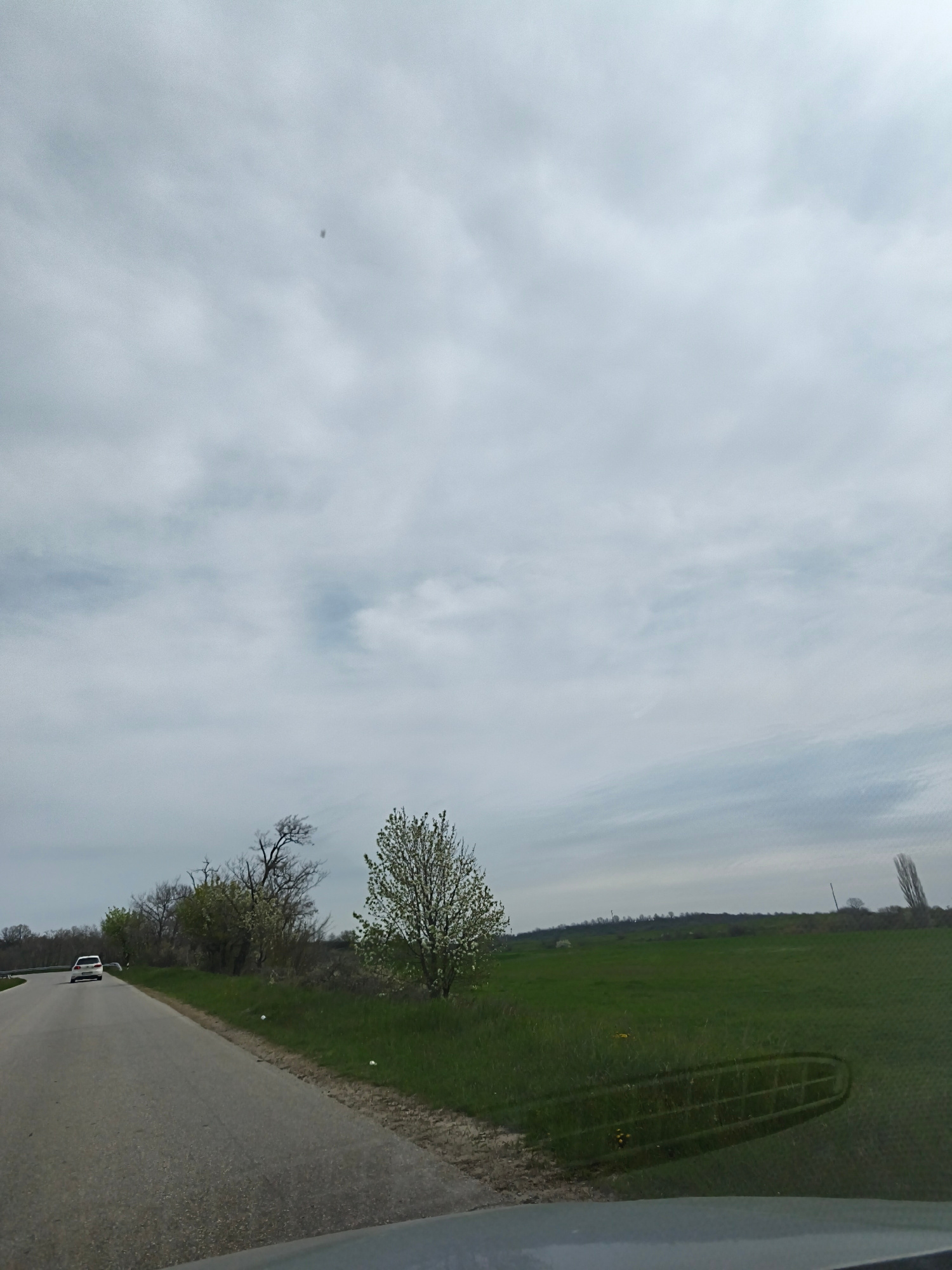 The image shows a road running through a rural area under a cloudy sky. A car is traveling on the road. To the right of the road is a grassy field with some trees. A windshield wiper is visible in the…read more