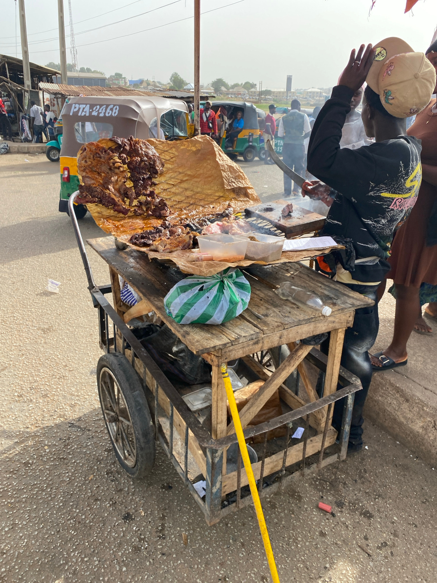 The image depicts a street food vendor in Bukuru, Nigeria, preparing and serving what appears to be roasted meat. The vendor, wearing a hat and long-sleeved shirt, is cutting the meat with a large kni…read more
