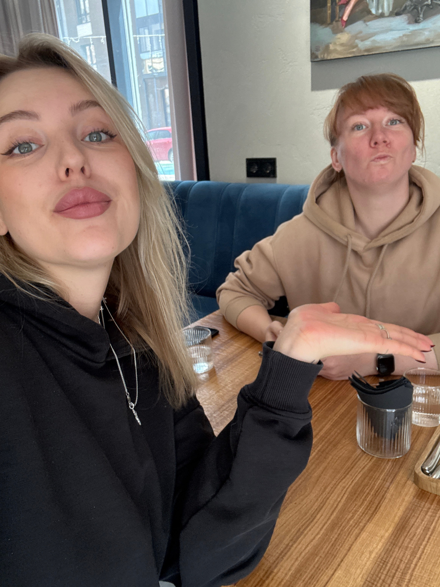 Two women sit at a wooden table in an indoor setting. One woman, with blonde hair and wearing a black hoodie, is in the foreground. The other woman, with reddish-brown hair and wearing a tan hoodie, i…read more