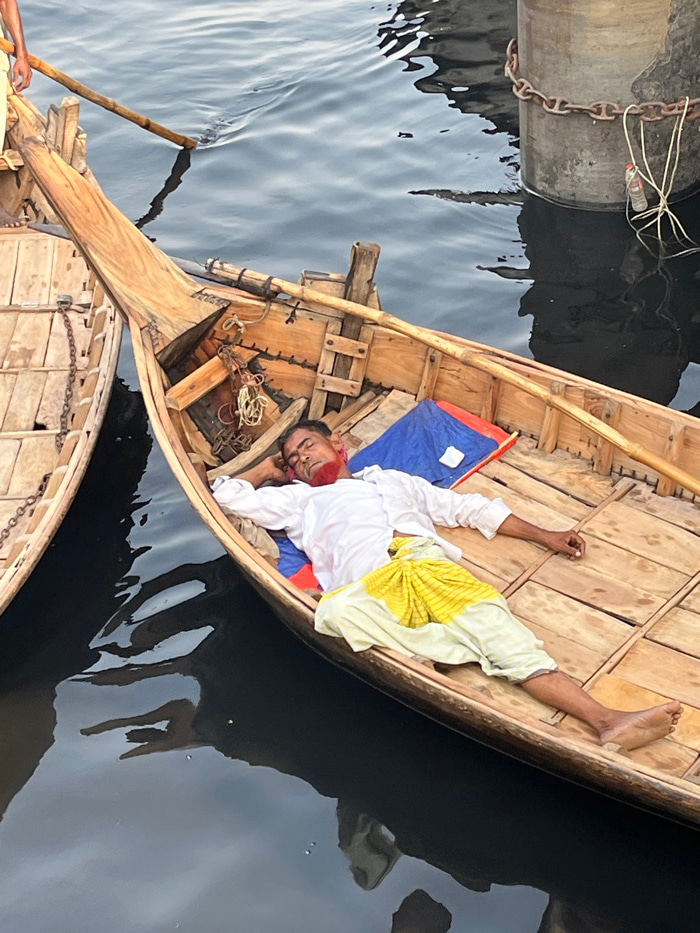 The image captures a scene on dark water, consistent with a riverfront or dock setting in Dhaka, Bangladesh, possibly along the Buriganga River. In the foreground, an adult male lies supine within a w…read more
