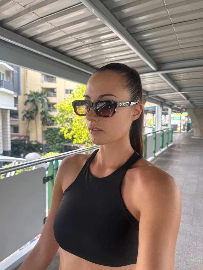 A female individual is depicted standing on an elevated pedestrian walkway, characteristic of the BTS Skytrain system in Bangkok, Thailand. She is positioned slightly off-center to the right, facing t…read more