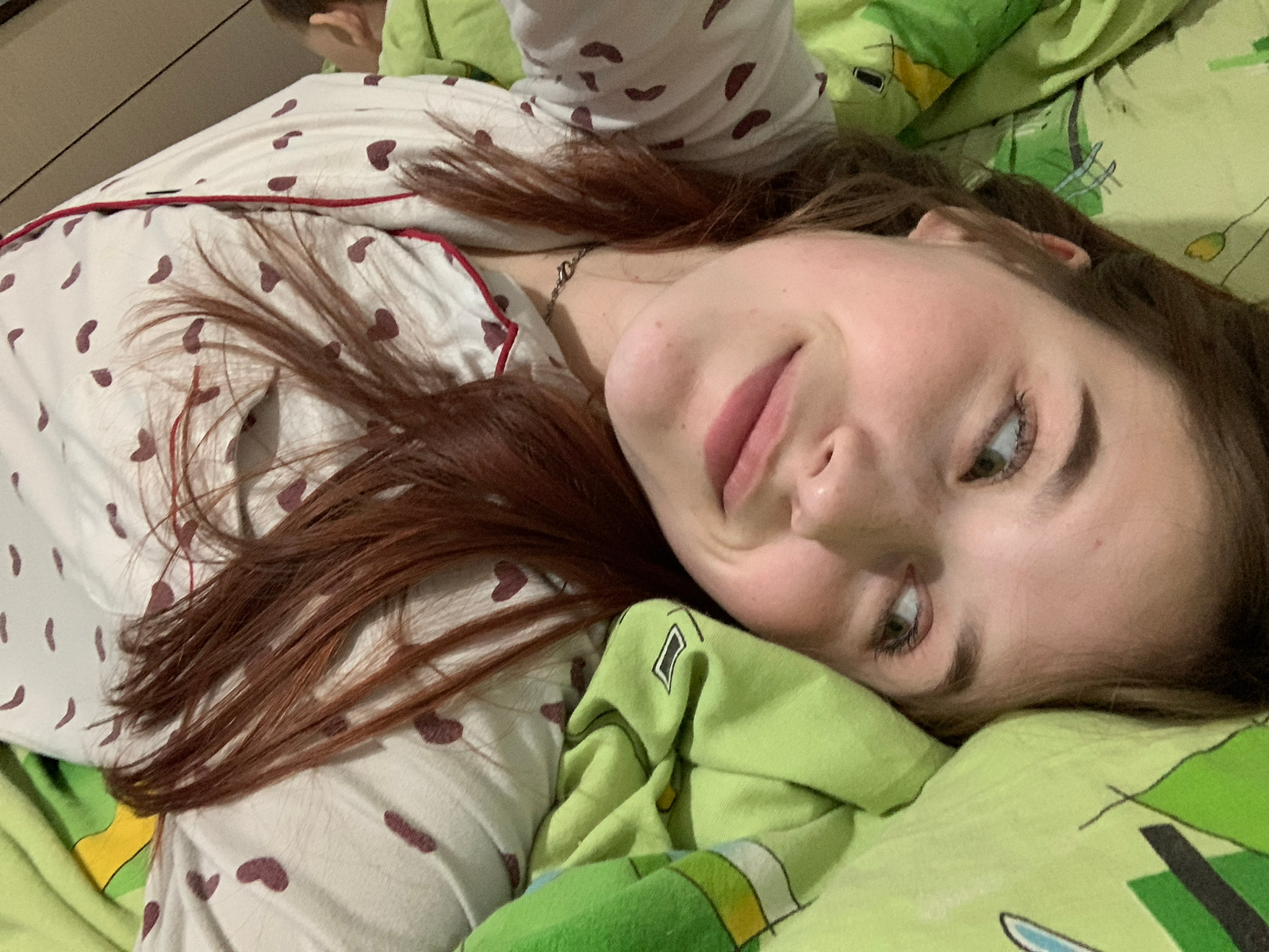 A young woman with light skin, auburn hair, and green eyes is lying down, presumably in bed, given the presence of green patterned bedding and her heart-patterned pajamas with red trim. She is looking…read more