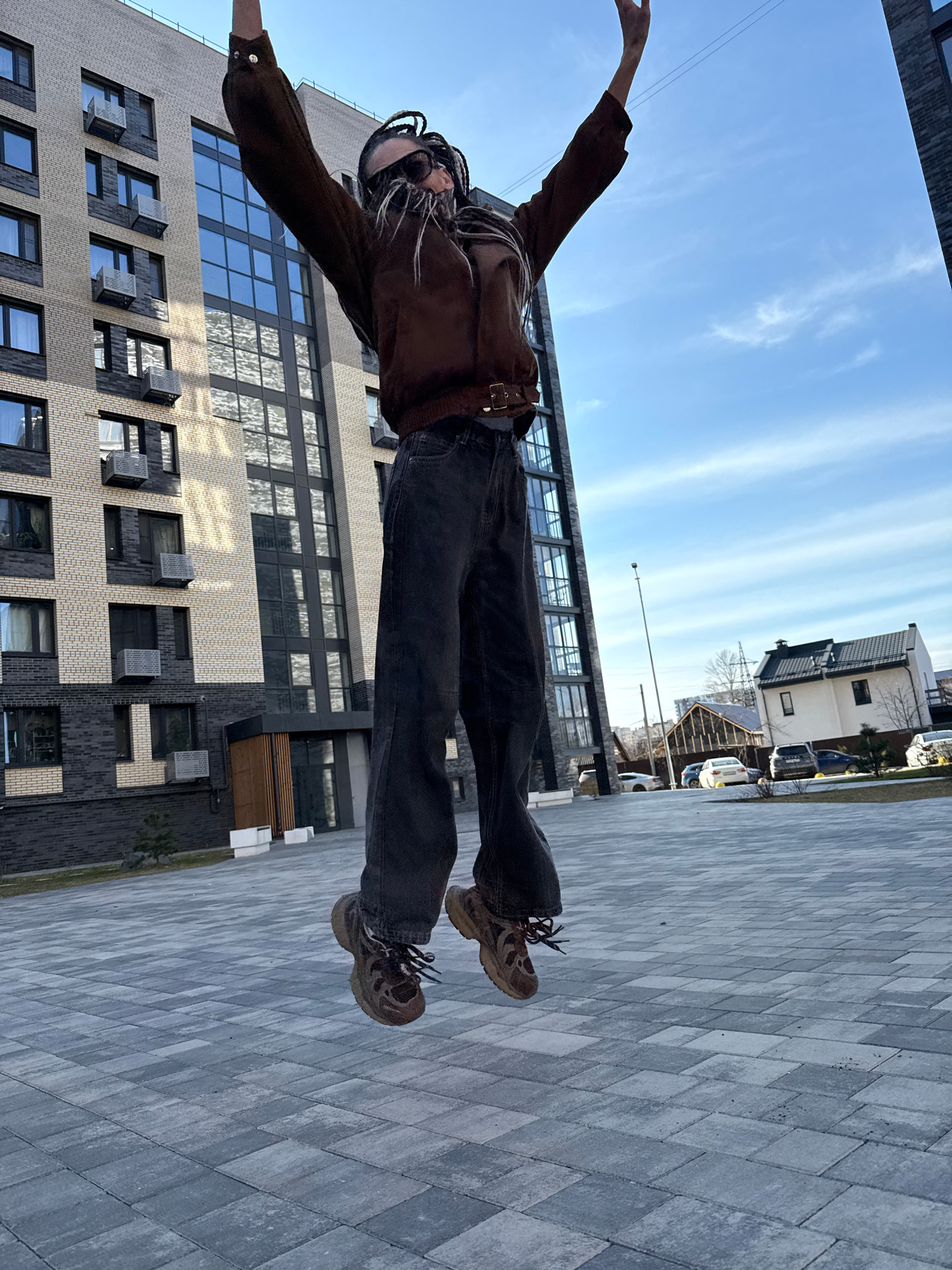 A person is posing in front of modern buildings and a brick-paved ground. The person is wearing a brown jacket, dark jeans, and sneakers. The buildings feature large windows and a mix of light and dar…read more