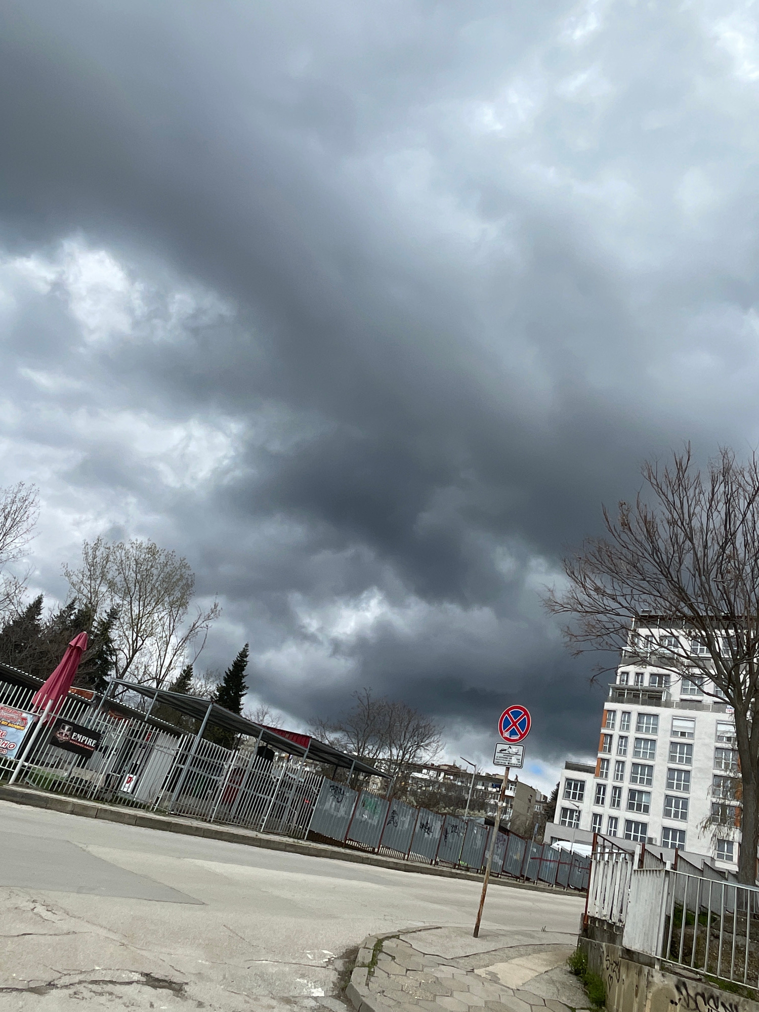 The image shows a street scene in Veliko Tarnovo, Bulgaria on an overcast day with a sky full of dark clouds. A building with multiple windows is visible on the right, along with a street featuring a…read more