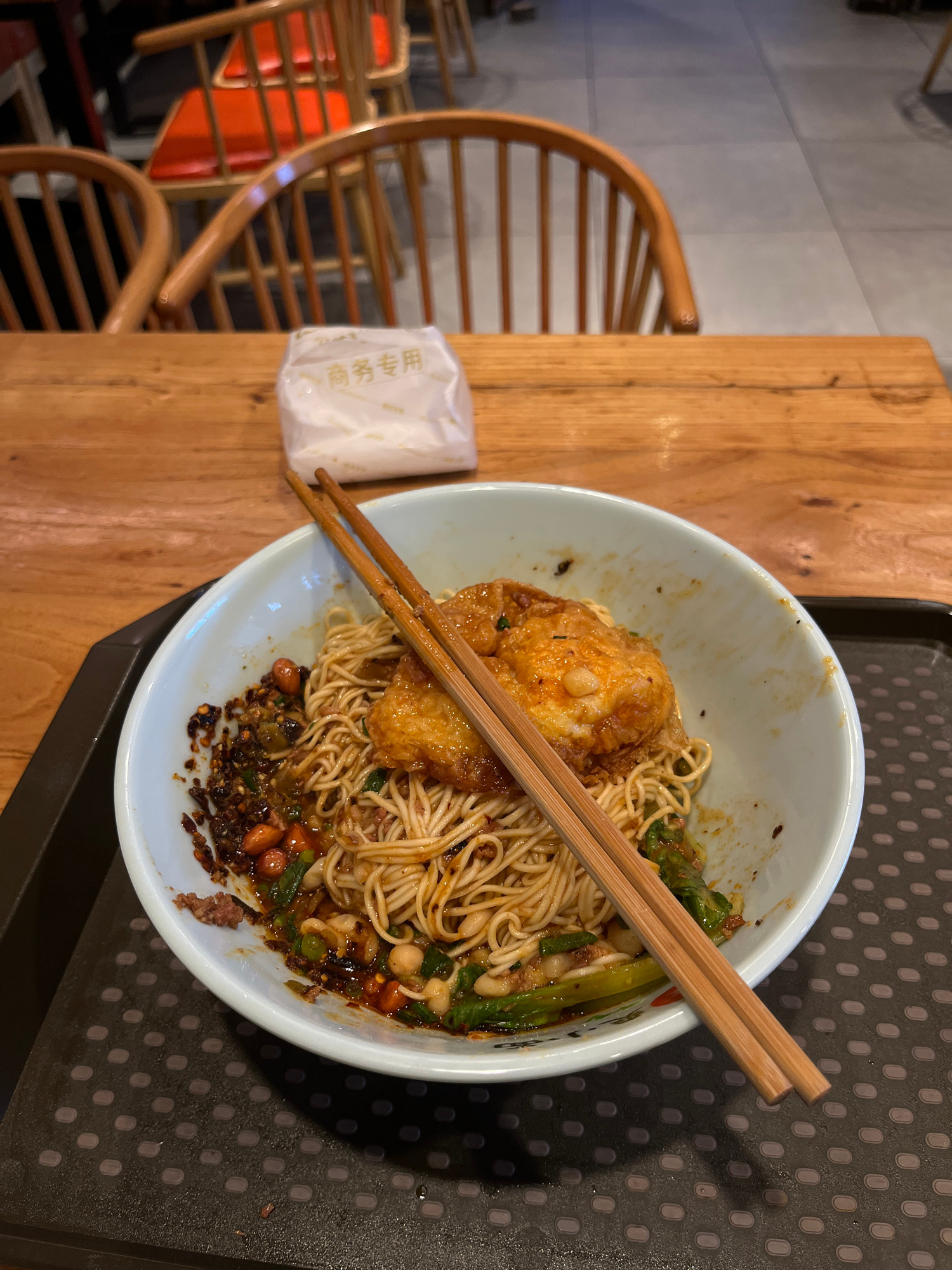 A medium shot, taken indoors, shows a bowl of noodles on a tray, with a packaged item and a chair partially visible. The bowl sits on a dark gray tray with a dotted pattern. Inside the bowl are noodleβ¦read more