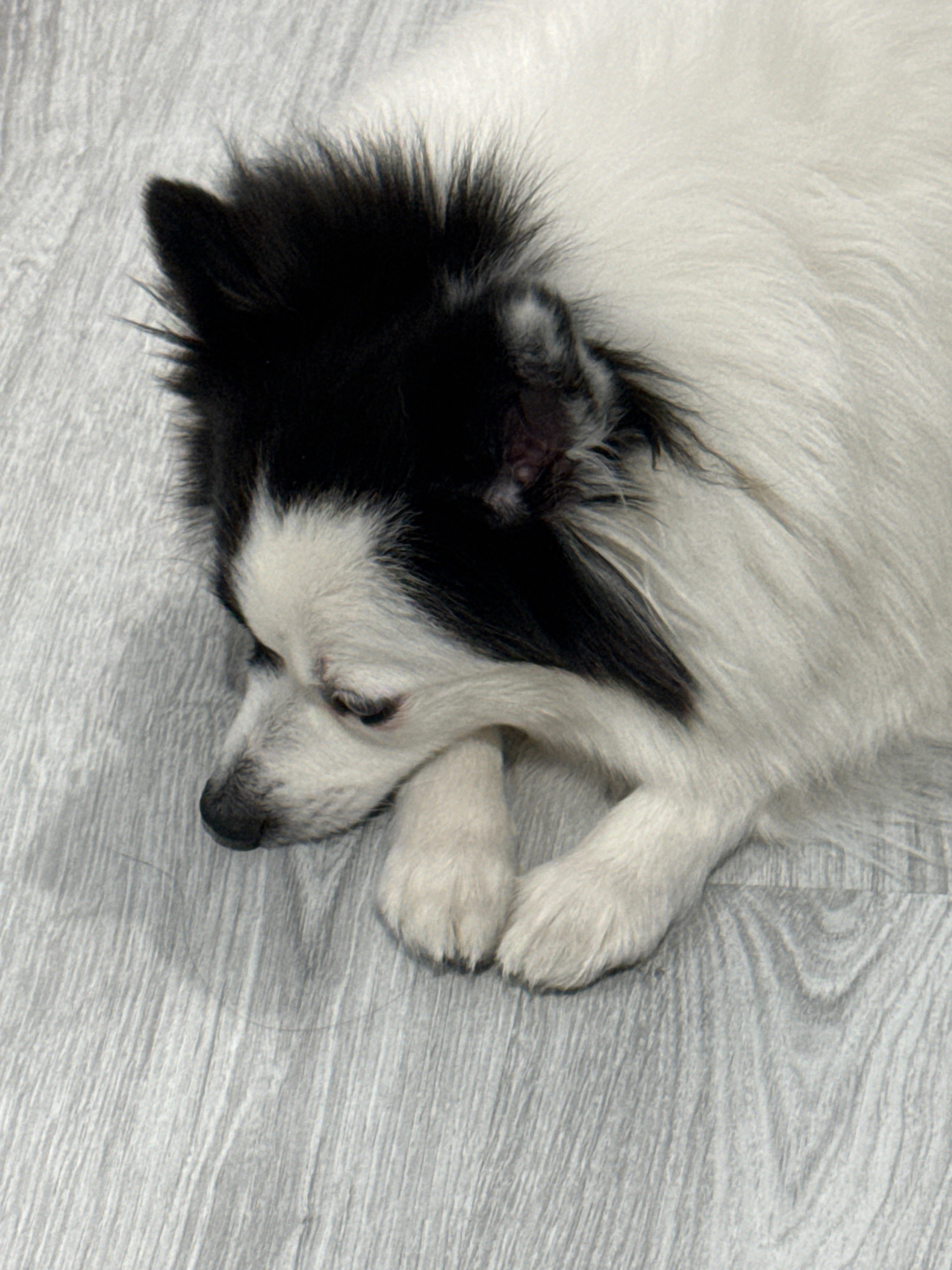 A black and white dog is curled up on a grey wood-look floor. The dog appears to be sleeping. The location is unknown and there is no evidence to indicate this photo was taken in the city of Stara Zag…read more