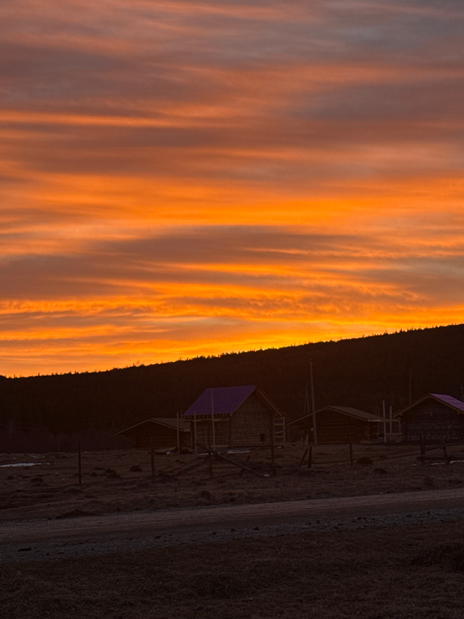 The image displays a rural landscape in Tyulyuk, Russia, during twilight hours. The upper two-thirds of the frame are dominated by a sky exhibiting strong orange and reddish-orange hues with pronounce…read more