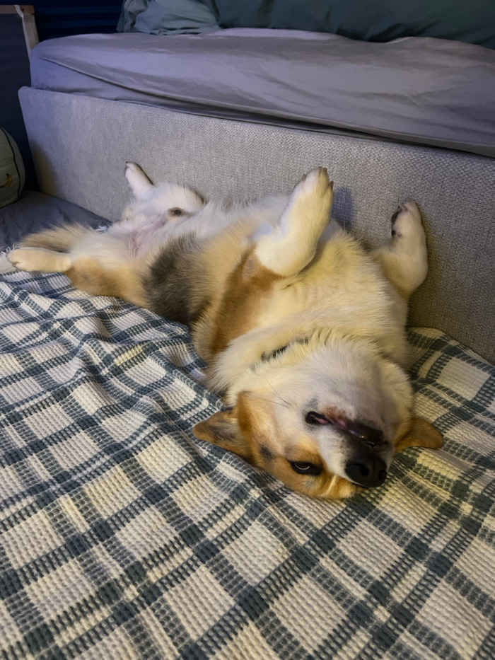 A tan and white corgi lies on its back on a grey couch. Its head rests against a plaid blanket, and its tongue sticks out slightly. The dog's paws are in the air. A grey couch is to the left of the do…read more