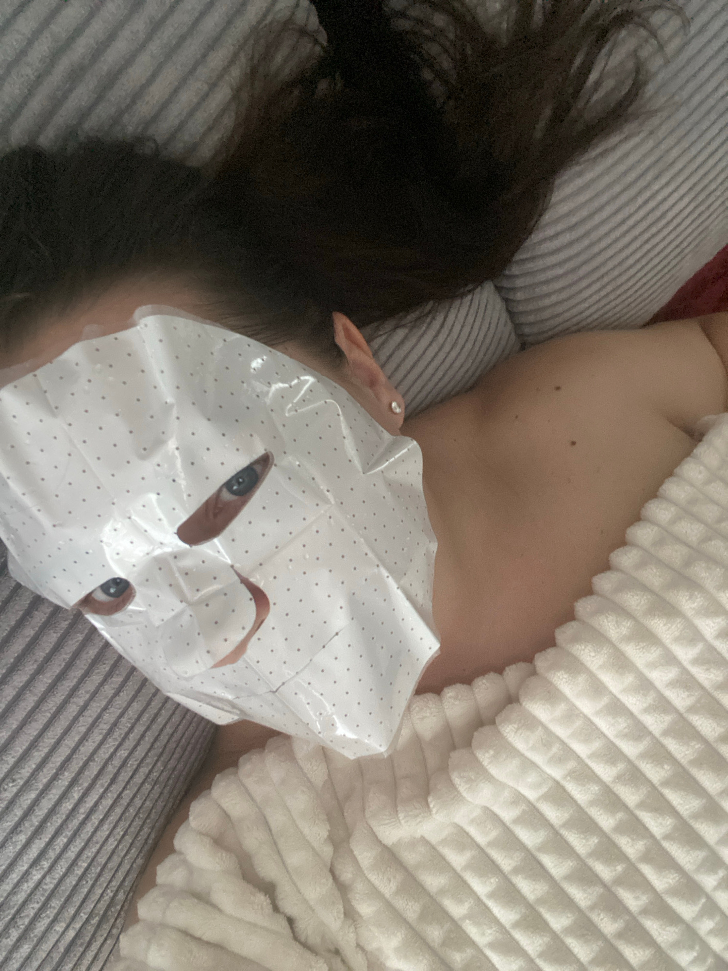 The photograph depicts a person lying down with a face mask on. The person's head is positioned on a gray striped pillow, and their dark hair is visible to the left. Part of the person's body is cover…read more