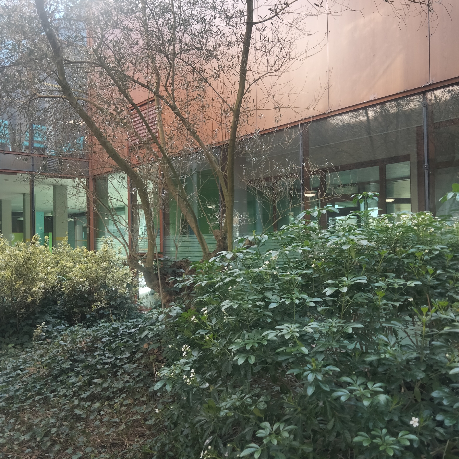 The image depicts a courtyard garden in Roubaix, France. A bare tree stands centrally, with green bushes and ivy covering the ground. Behind the greenery is a modern building with copper paneling abov…read more