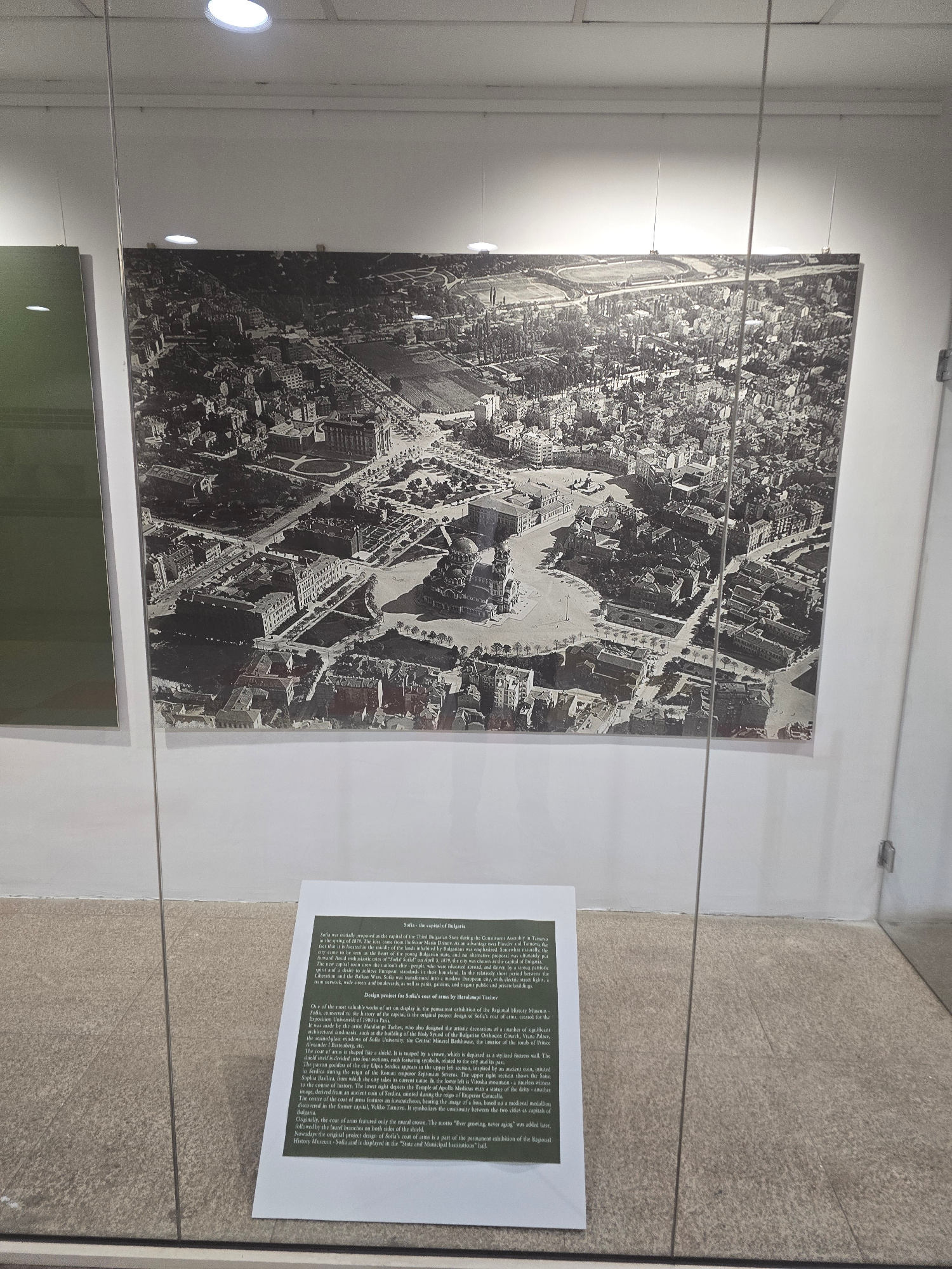 The image shows a display in a museum featuring two framed items: a large black-and-white aerial photograph and a smaller descriptive plaque. The photograph depicts an aerial view of a city, presumab…read more