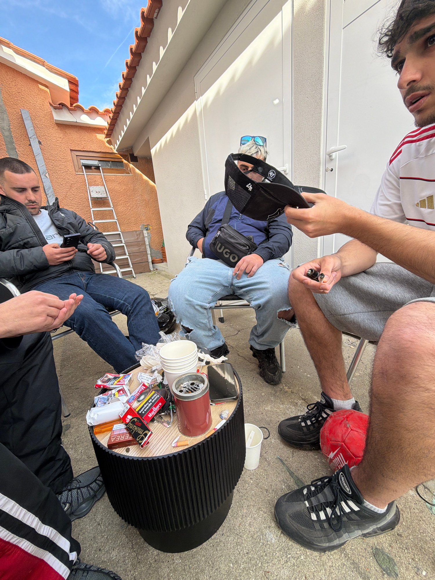 The image shows a group of young men gathered outdoors, likely in Vila Real, Portugal, as evidenced by Portuguese-language cigarette packaging visible on the table. The setting appears to be a backyar…read more