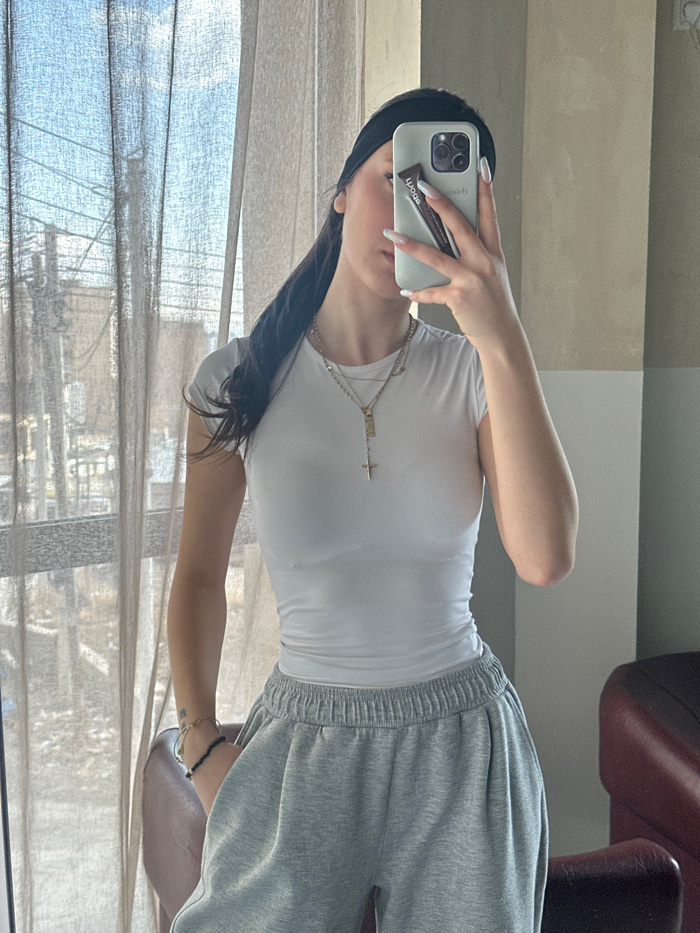The image depicts a female subject taking a mirror selfie indoors. The subject is partially visible, with her face largely obscured by a light green smartphone, an iPhone 13 or 14 Pro Max model, held…read more