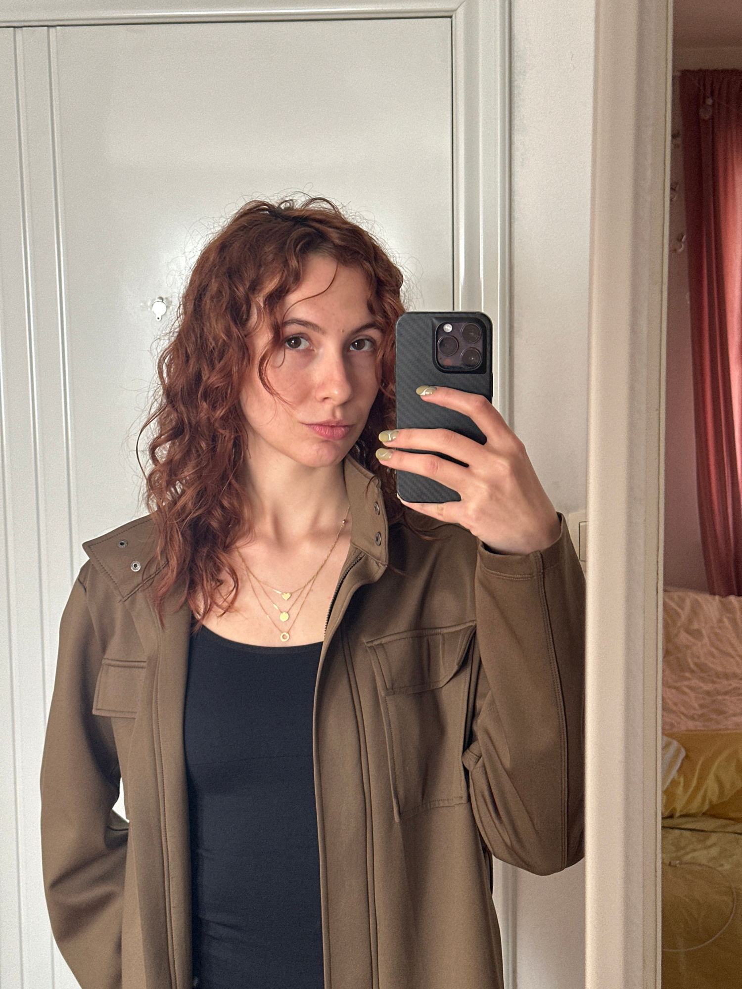 A woman with red curly hair is taking a selfie in a mirror. She is wearing a black top and a brown jacket, and a gold necklace is visible around her neck. She is holding a black smartphone with a prot…read more