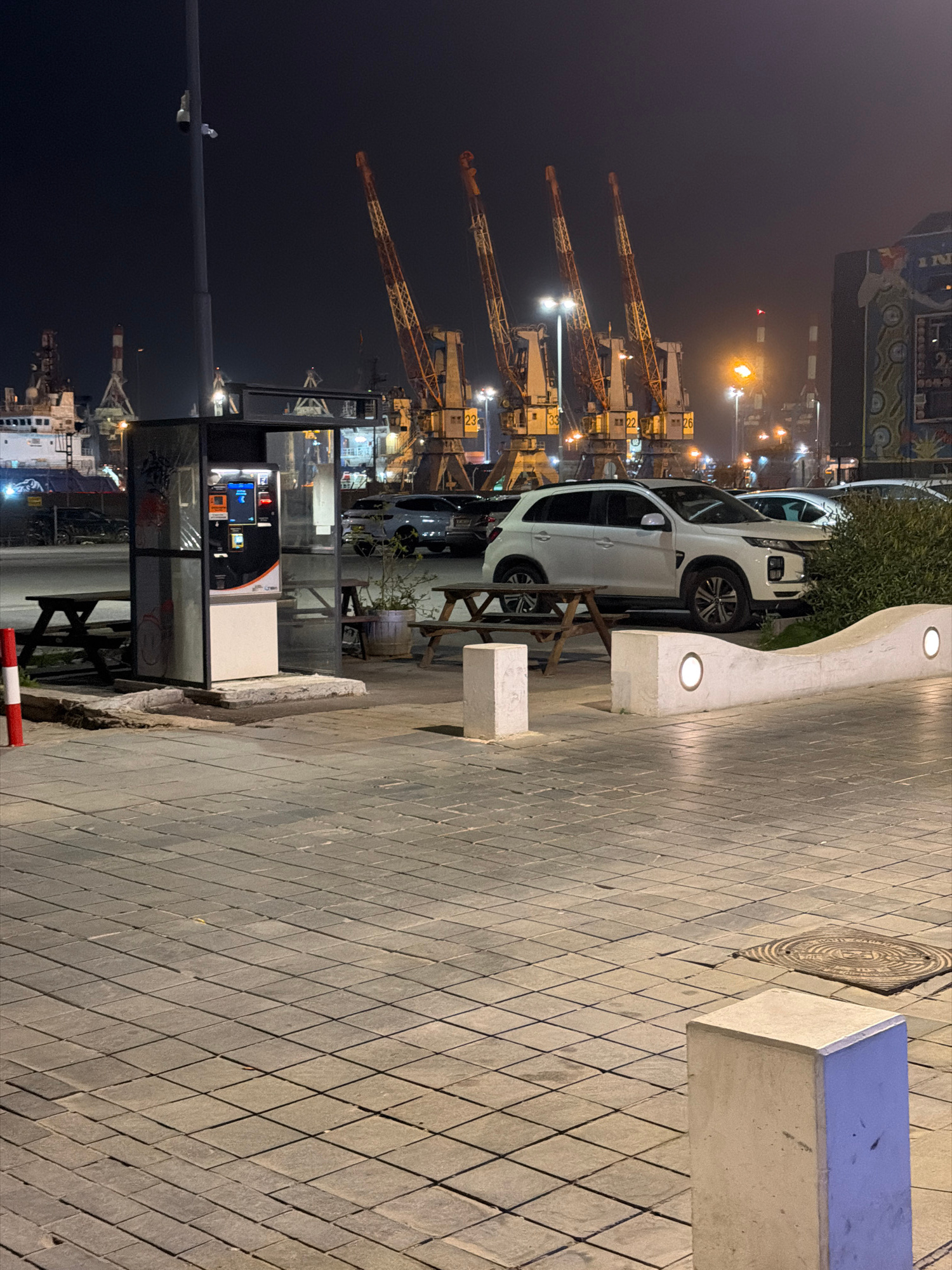 This nighttime image captures a scene at the Port of Haifa in Israel. It shows several dockside cranes lit up against the dark sky, reflecting the industrial activity of the area. A white SUV is parke…read more