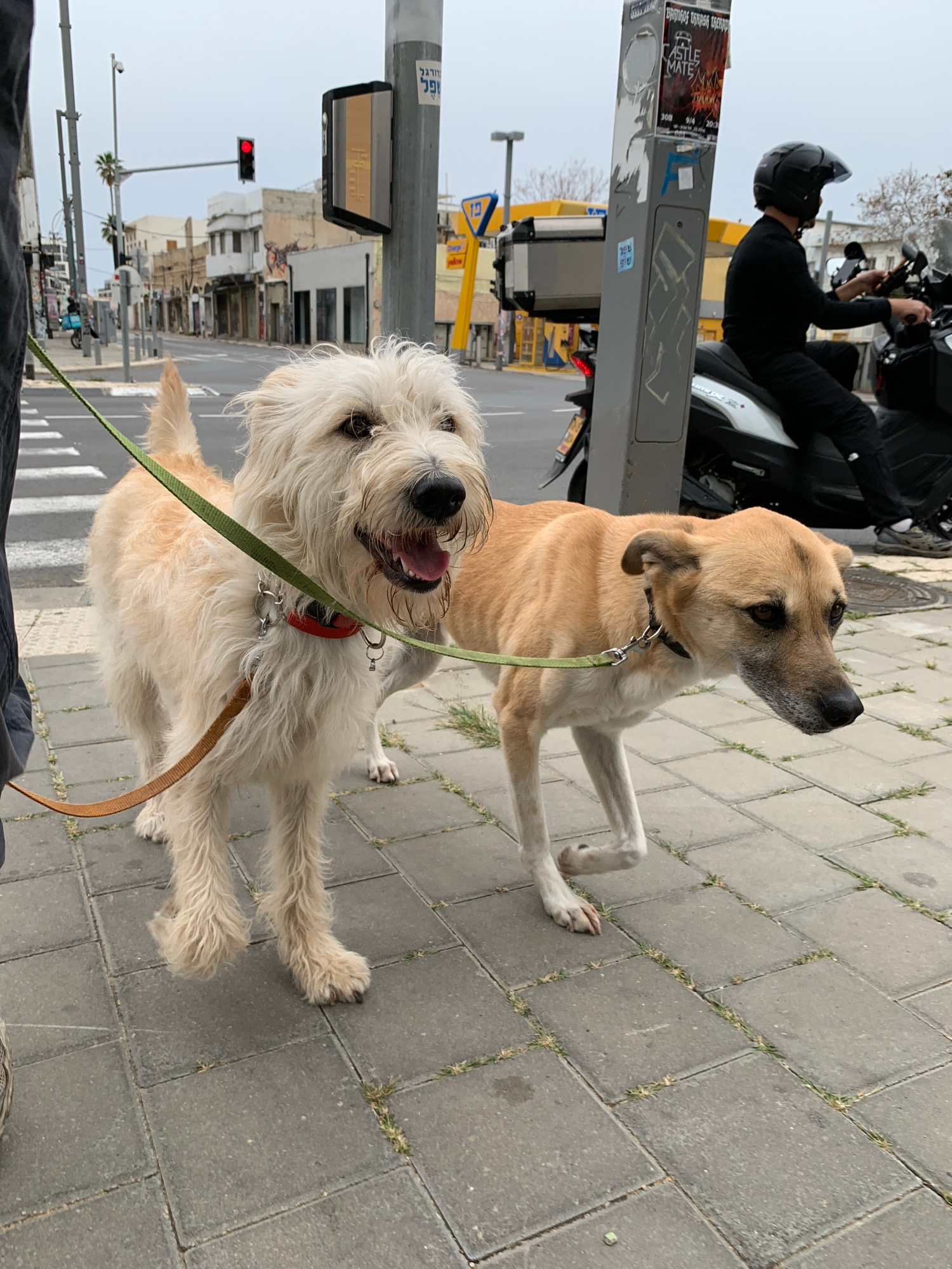 Two dogs on leashes are standing on a gray brick sidewalk. A light-colored, shaggy dog with a red collar is positioned slightly behind and to the right of a tan dog. A green leash connects the tan dog…read more