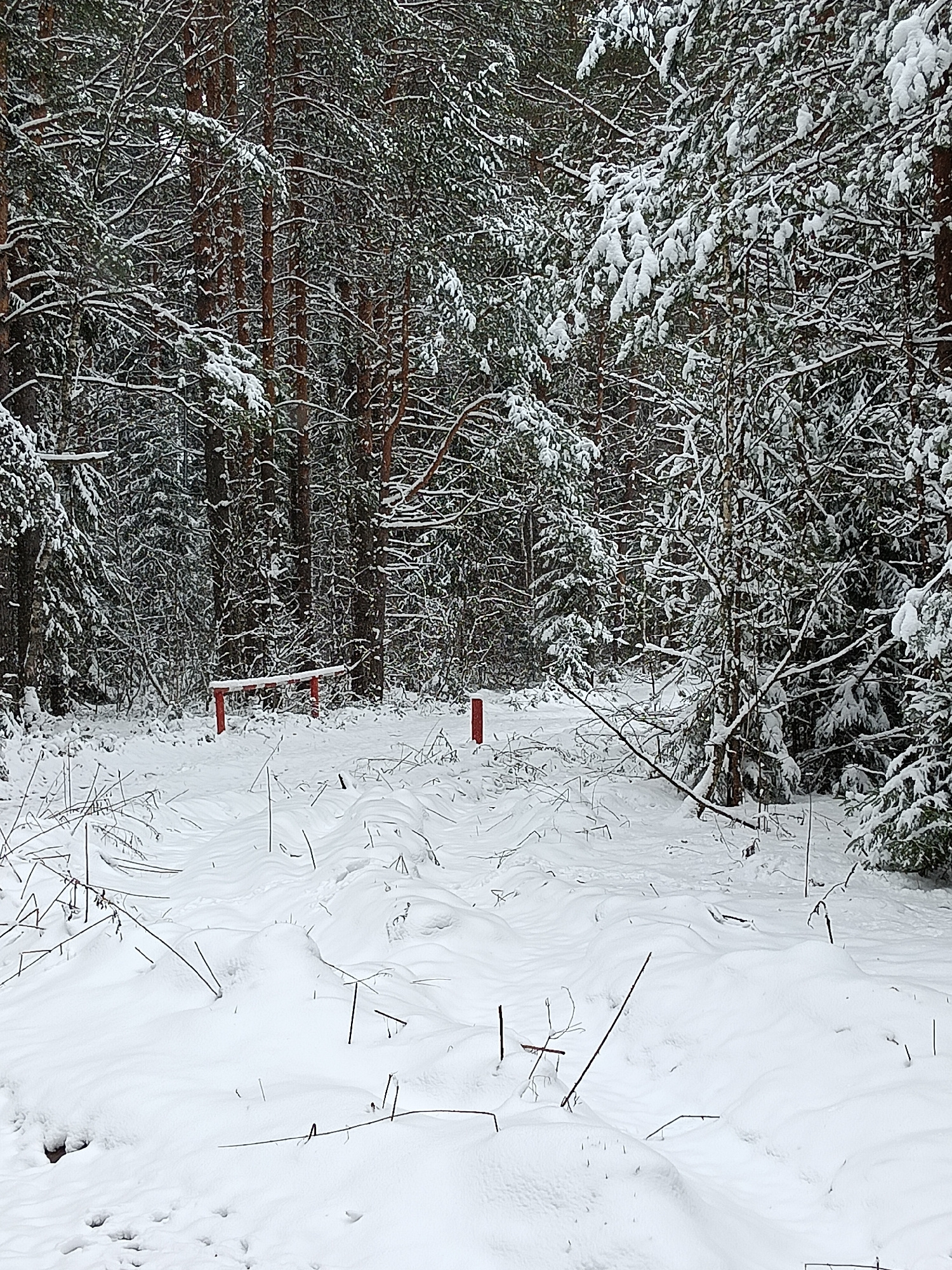 A quiet, snow-covered forest scene unfolds on a cold, overcast winter day in Красный Маяк, Russia. The image captures a clearing or a path within a dense evergreen forest, where tall pine and spruce t…read more