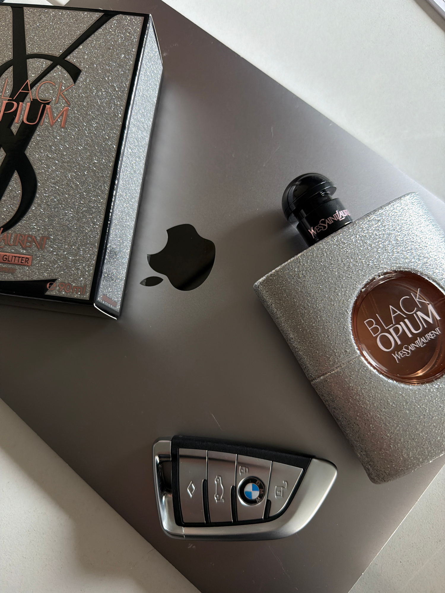 The image shows a silver laptop with an Apple logo on a light surface, likely a table. A bottle of Yves Saint Laurent Black Opium perfume with silver glitter is placed on the upper left of the laptop.…read more