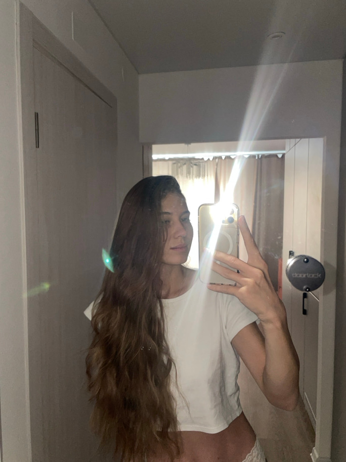 A female is depicted taking a mirror selfie within an interior room, likely a hotel room or serviced apartment, located in Khimki, Russia. The individual, possessing long, wavy, brown hair, is dressed…read more
