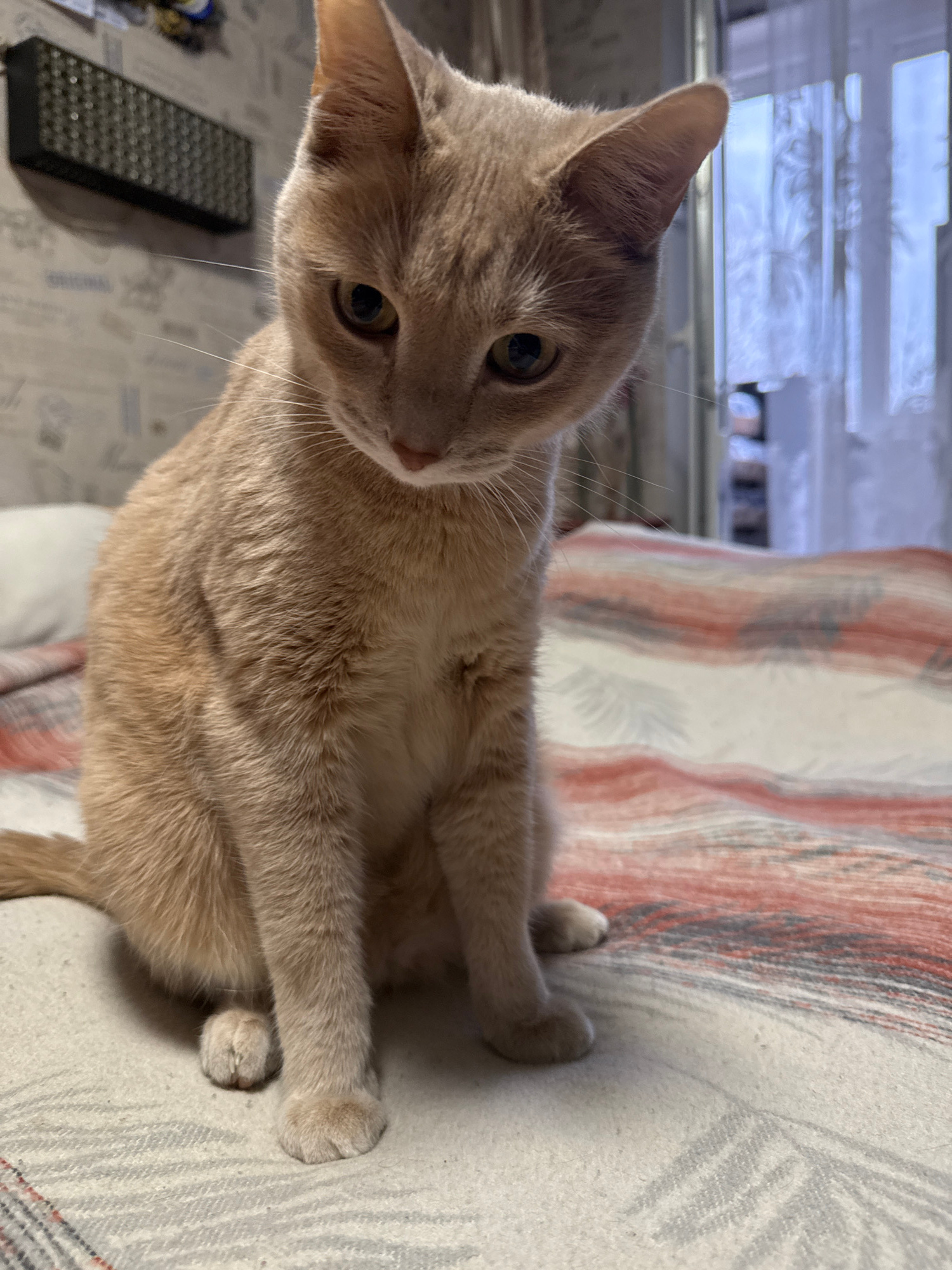 A medium-sized, light-orange cat is lying on a light-colored blanket with red and gray patterns. The cat is facing the camera with its body angled slightly to the right. The cat's legs are crossed. Be…read more