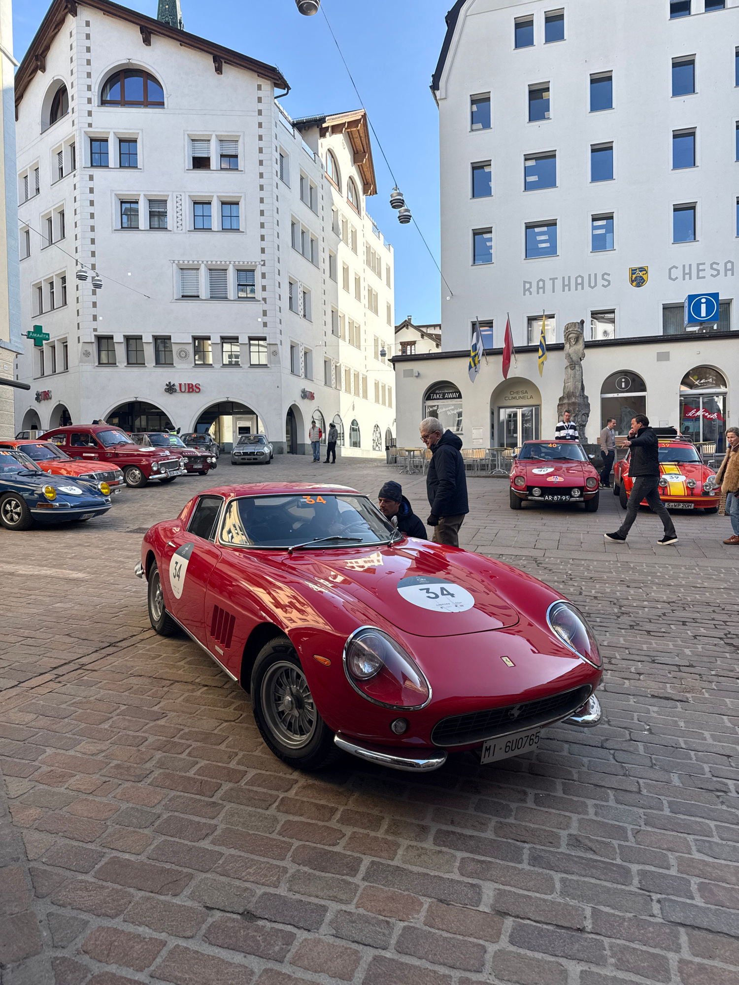 The image presents a daytime scene in the cobblestone-paved square of Sankt Moritz, Switzerland. The central focus is a bright red vintage Ferrari, identified by '34' white circular decals on its hood…read more