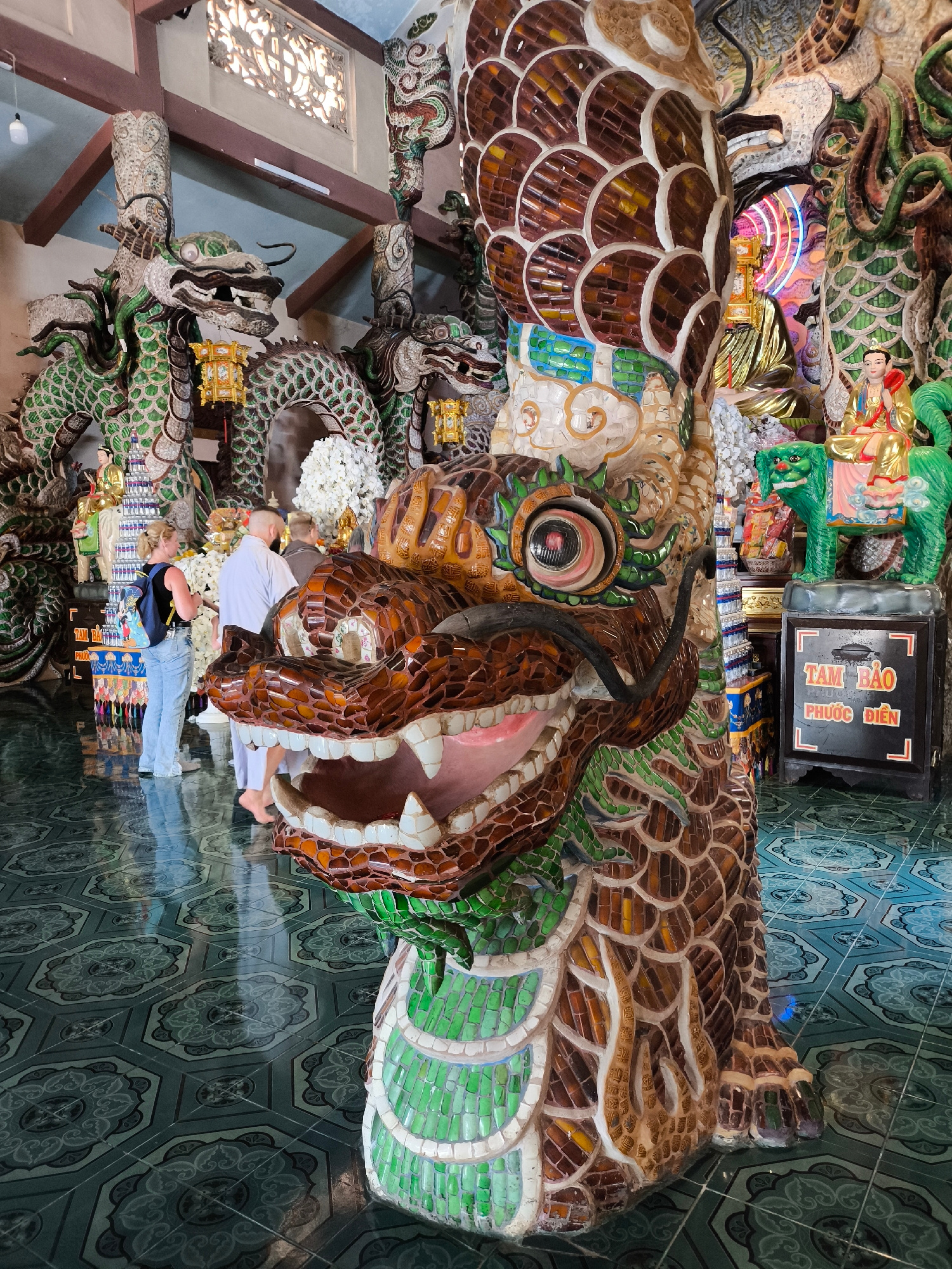 The photo shows the interior of a temple in Lâm Viên - Đà Lạt, Vietnam. The floor is covered with hexagonal tiles in a green and grey pattern. The foreground is dominated by a dragon sculpture made of…read more