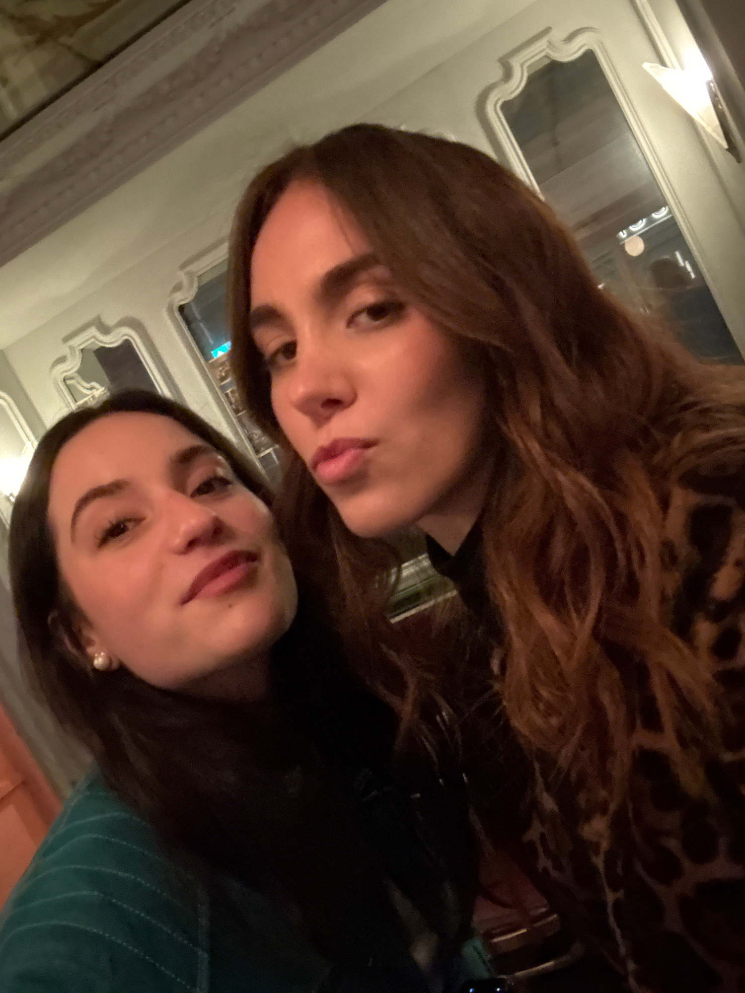 Two young women are posing for a selfie indoors. The woman in the lower half of the frame has dark brown hair and is wearing an earring. The woman in the upper half of the frame has brown hair and is…read more