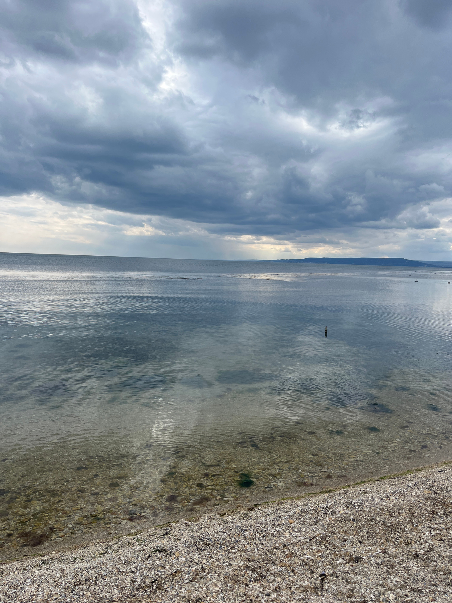 The image shows a view of the sea at Balchik, Bulgaria, taken from the shore. The sky is filled with gray clouds, with some lighter patches. The sea is calm, with gentle ripples on the surface. In the…read more