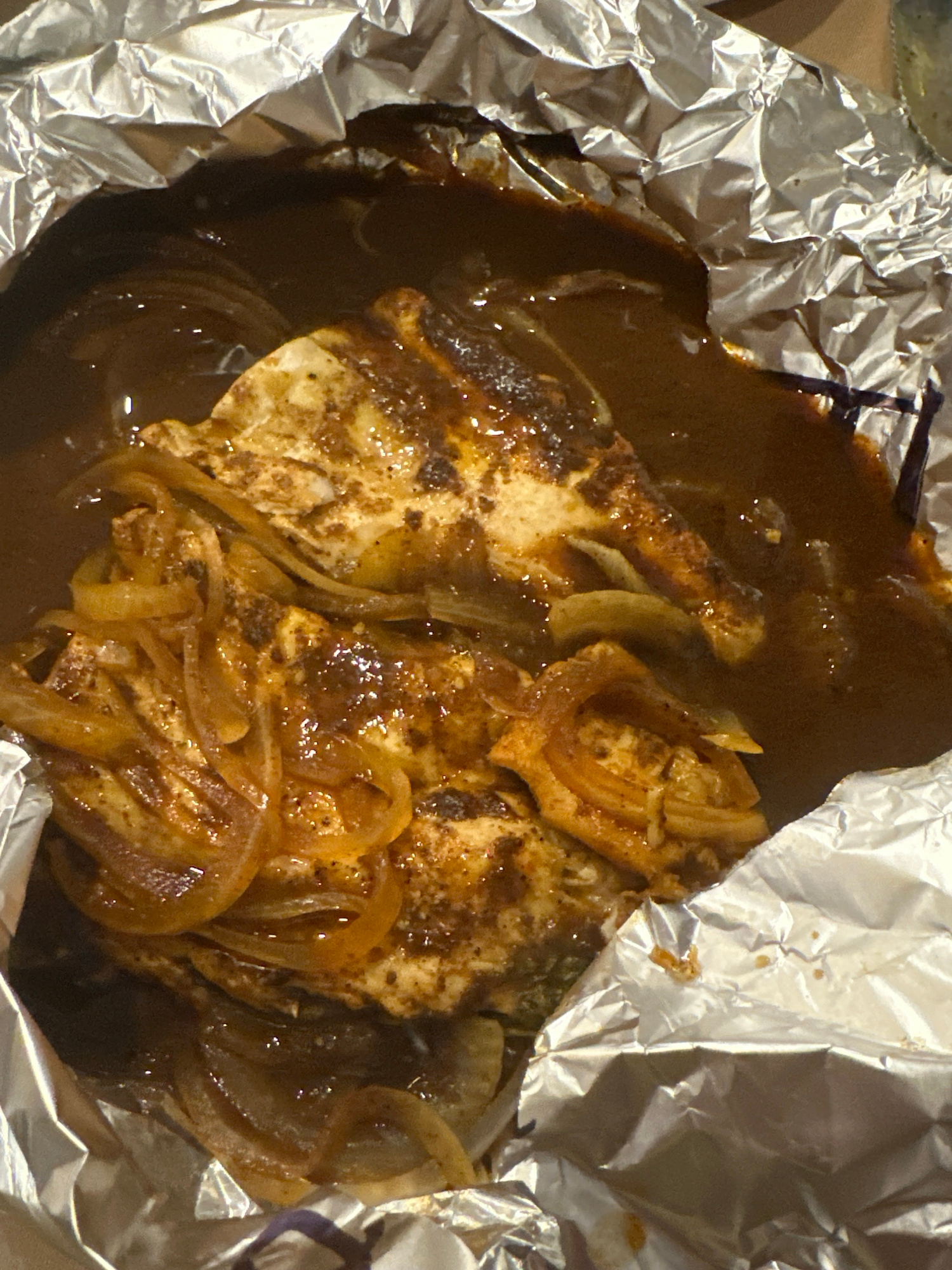 A close-up shot shows food wrapped in aluminum foil, likely a takeout container. The food appears to be slices of grilled chicken, covered in a dark brown sauce, with sauteed onions. The background isβ¦read more