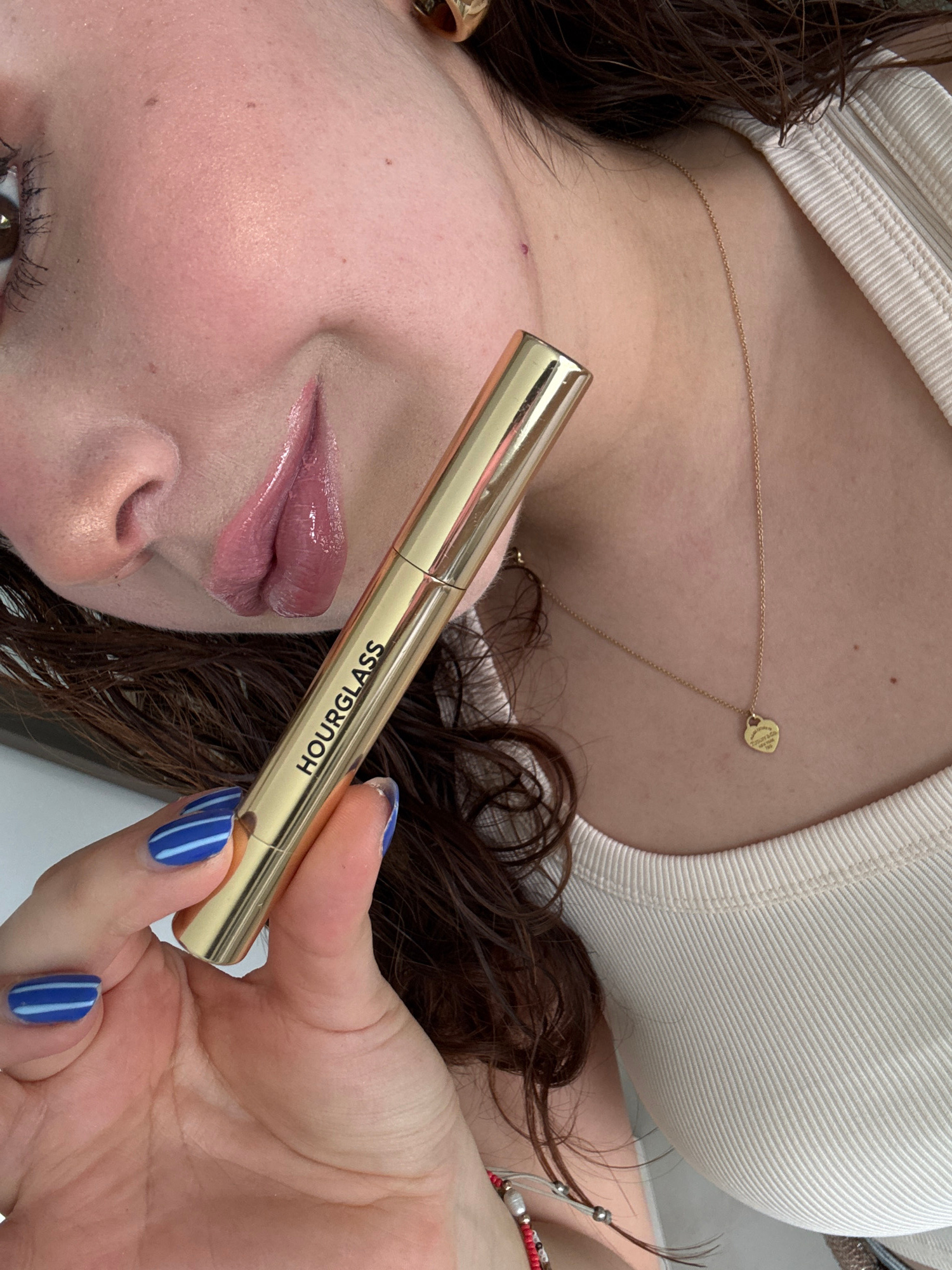 A selfie shows a woman holding a gold-colored tube labeled "HOURGLASS" near her face. Her skin appears to be fair, and she is wearing a shiny lip gloss. Her fingernails are painted blue with white str…read more