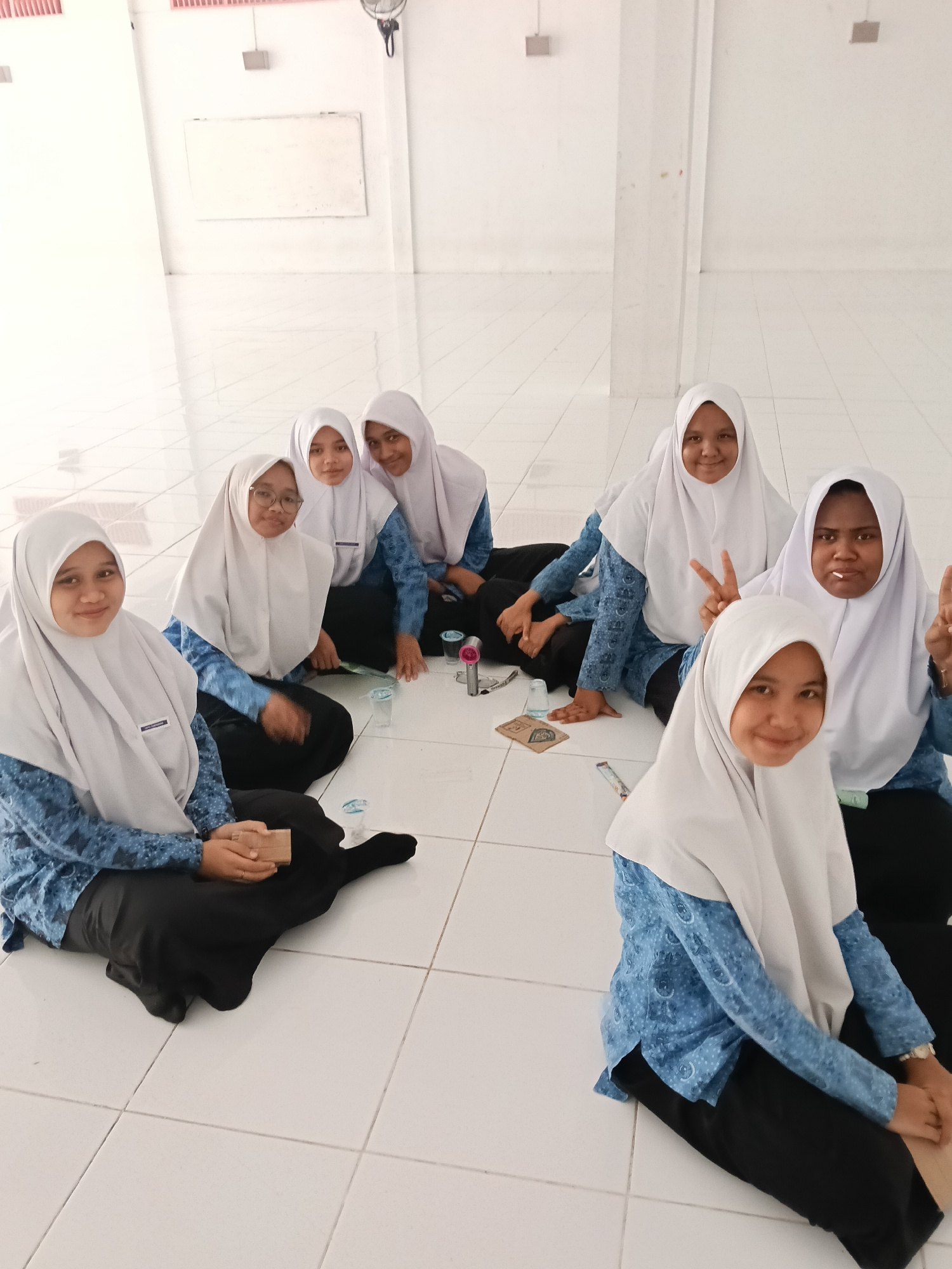 A group of seven young women wearing white headscarves and blue patterned shirts are sitting on a white tiled floor indoors. The room appears to be in a public building, possibly a school, located in…read more
