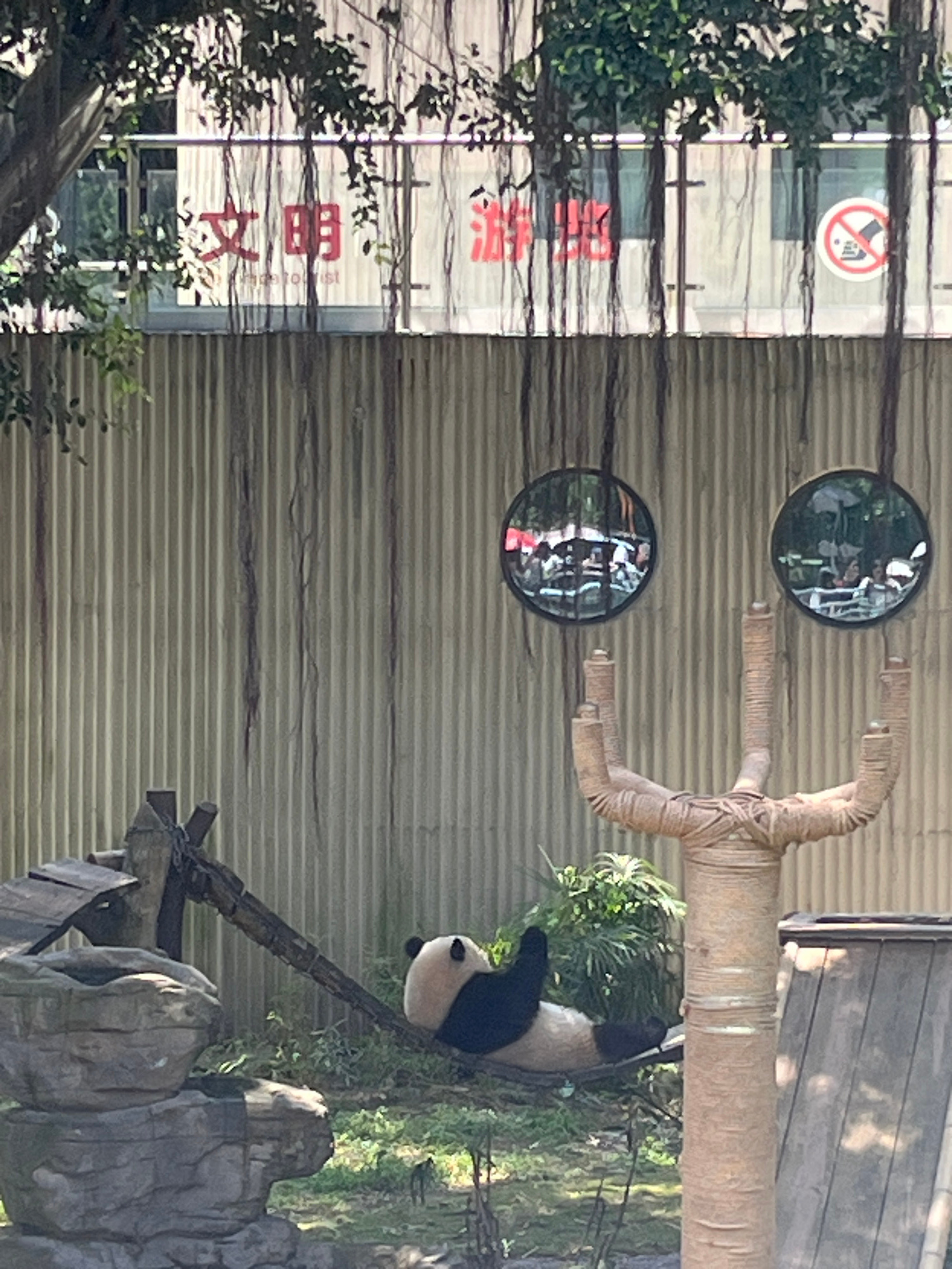 A panda is resting on a structure in a zoo. The panda is positioned on a wood structure and faces to the left. The background includes a building with two round windows, a “no smoking” sign, and trees…read more