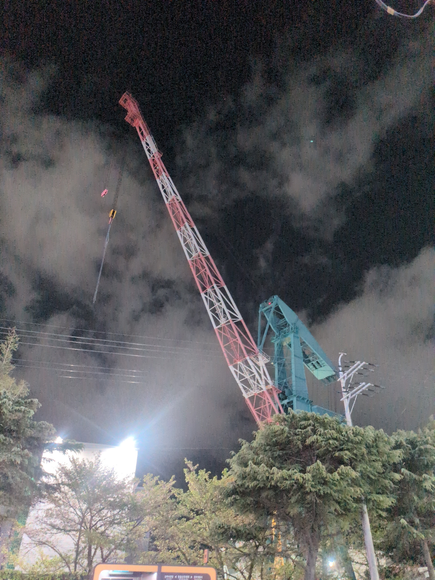At night, a long, red and white crane extends from a blue structure near a light source. Another crane appears smaller in the distance. Tall trees and electrical wires are visible. The location is lik…read more