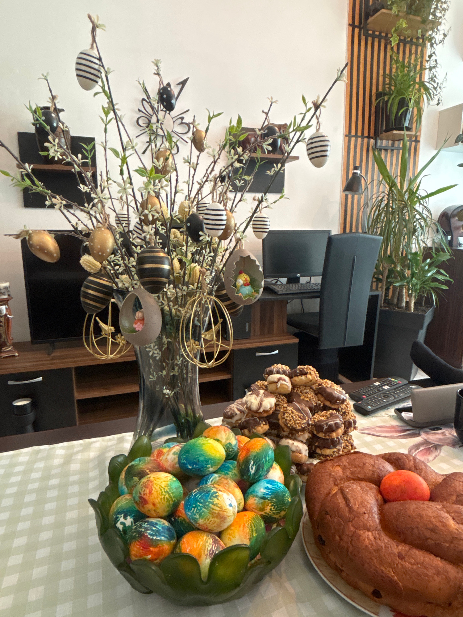 The image depicts a festive Easter scene indoors, likely in a home. A table covered with a checkered tablecloth holds a variety of Easter-themed items. A decorative Easter tree made of branches adorne…read more