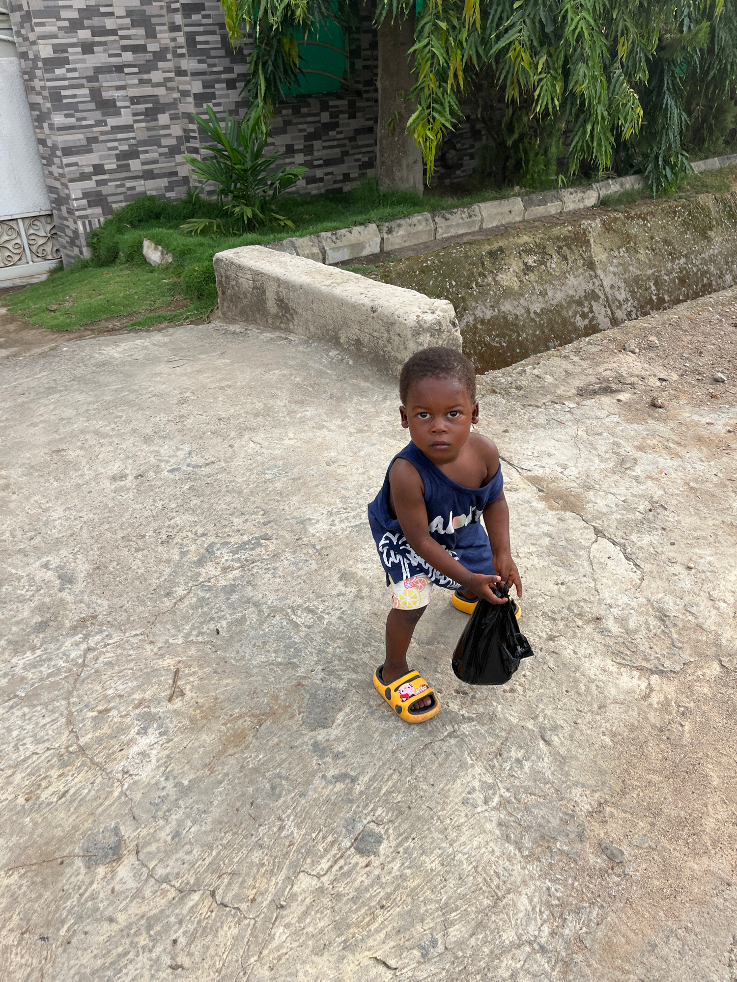 A small child stands on a concrete surface, likely a walkway or patio. The child, who appears to be of African descent, is wearing a blue tank top, patterned shorts, and yellow sandals with a cartoon…read more