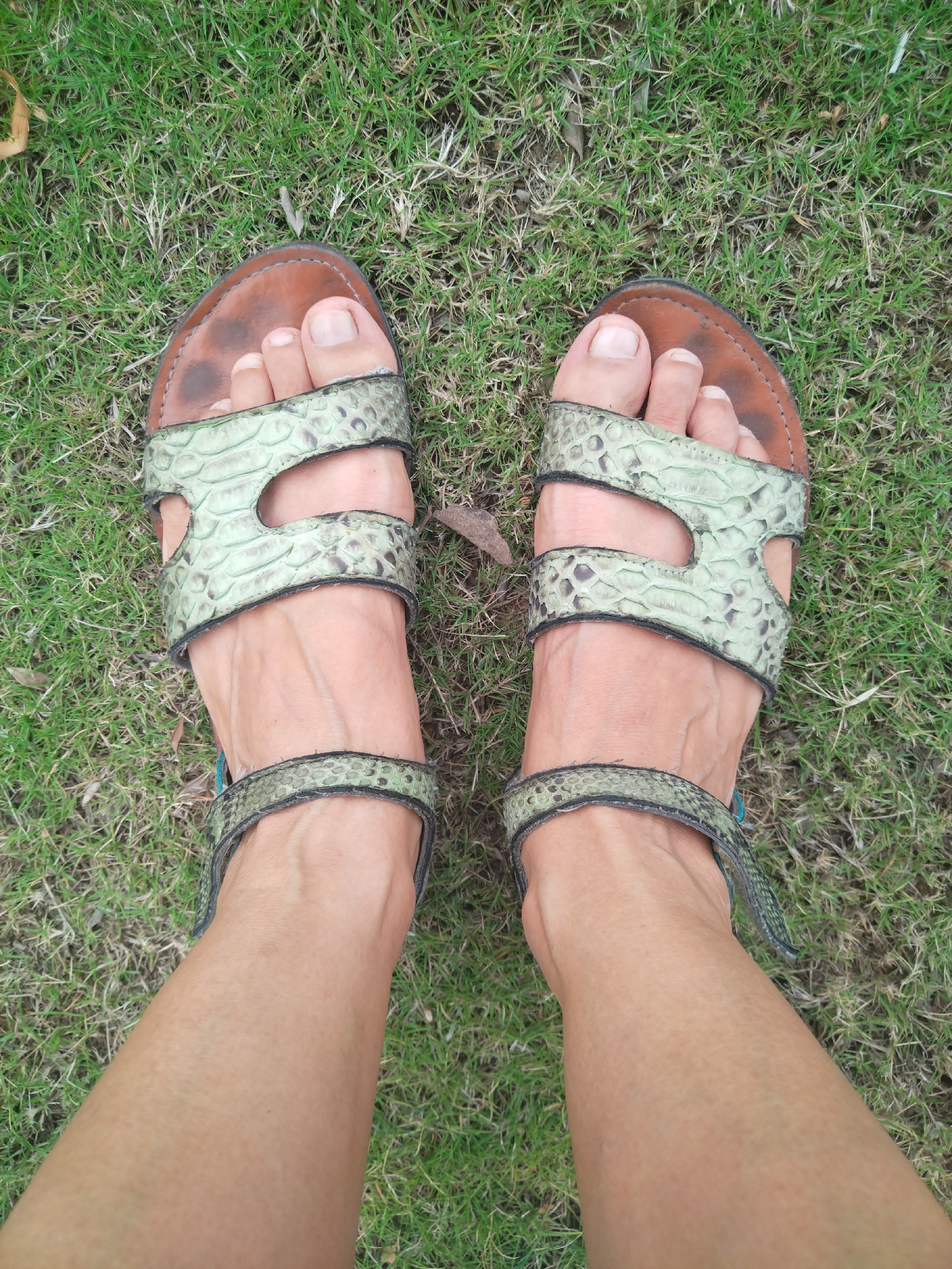 A pair of feet wearing green snakeskin-patterned sandals are standing on a patch of green grass. The sandals have a brown sole and two straps across the top of each foot and a single strap around the…read more