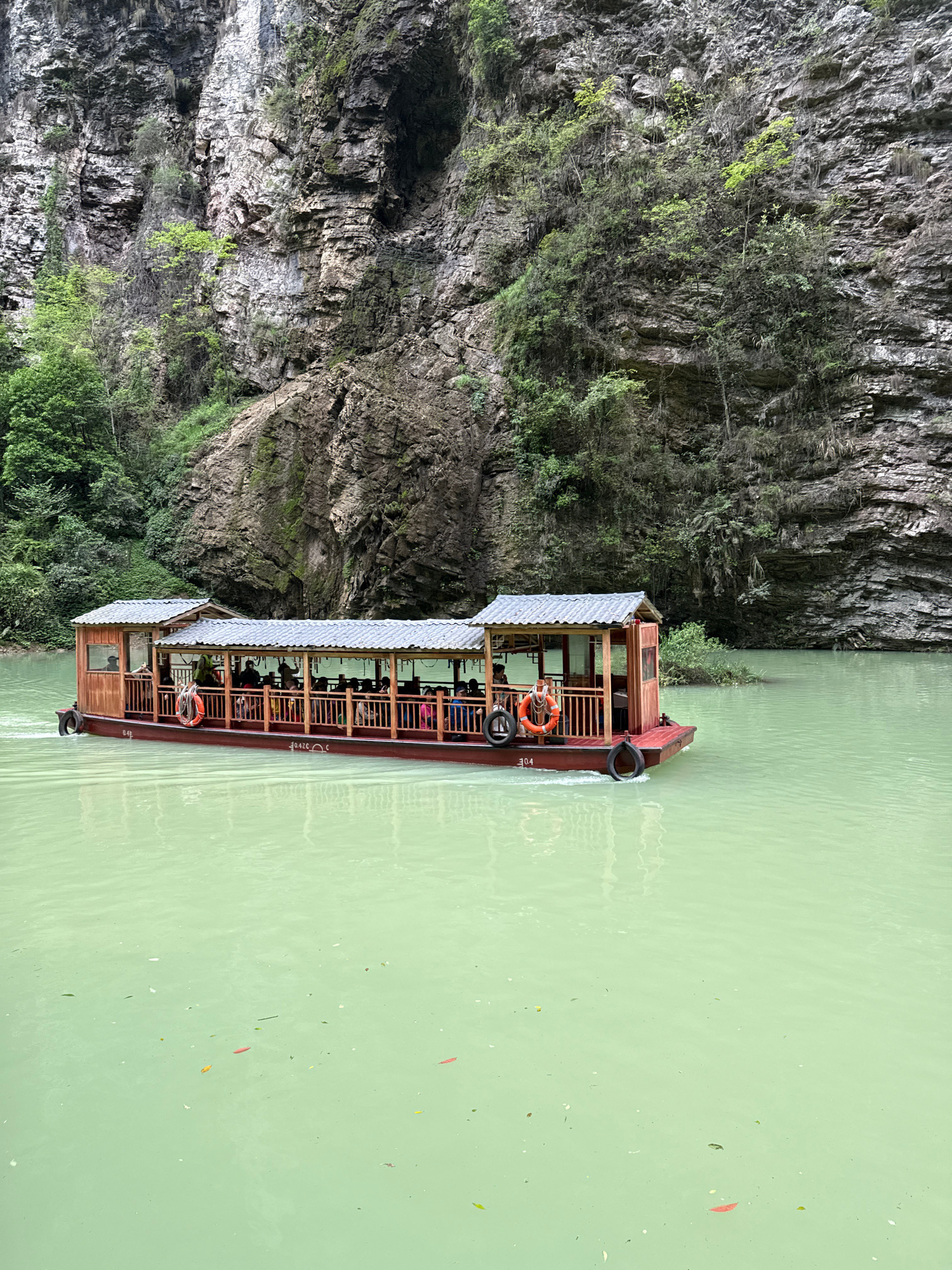 The image captures a boat navigating a river adjacent to a steep, rocky cliff face. The boat, a long, narrow vessel, is designed for passenger transport, featuring a covered roof structure and visible…read more