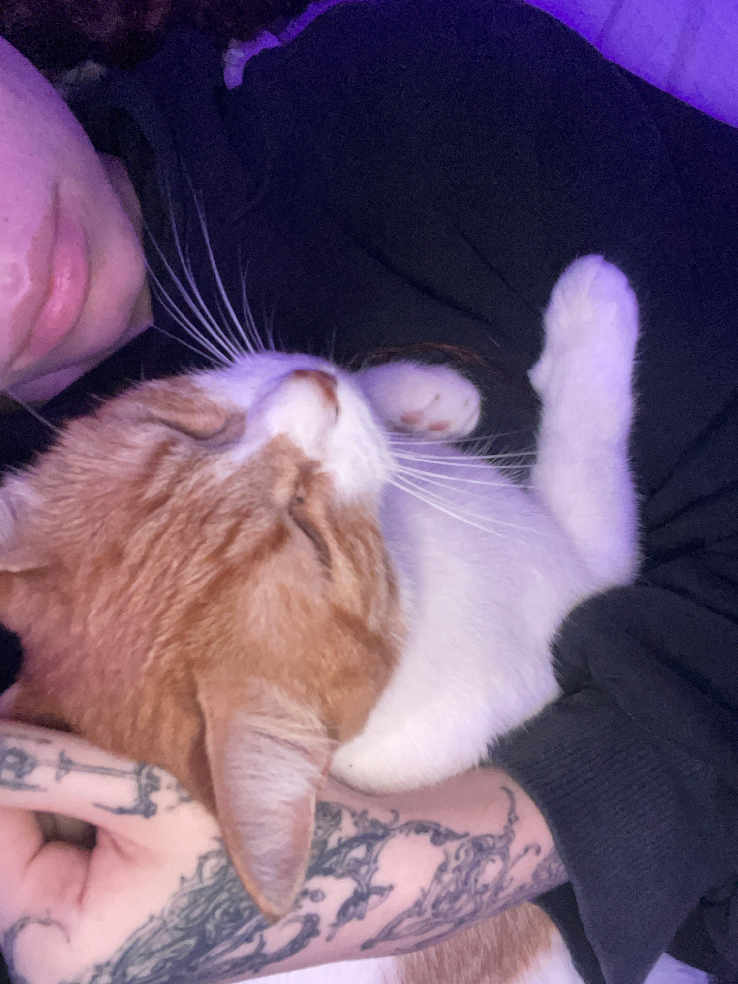 A close-up image shows a person holding a cat. The cat is orange and white, sleeping with its eyes closed. The person has tattoos on their arm and hand. The background includes black clothing and a pu…read more