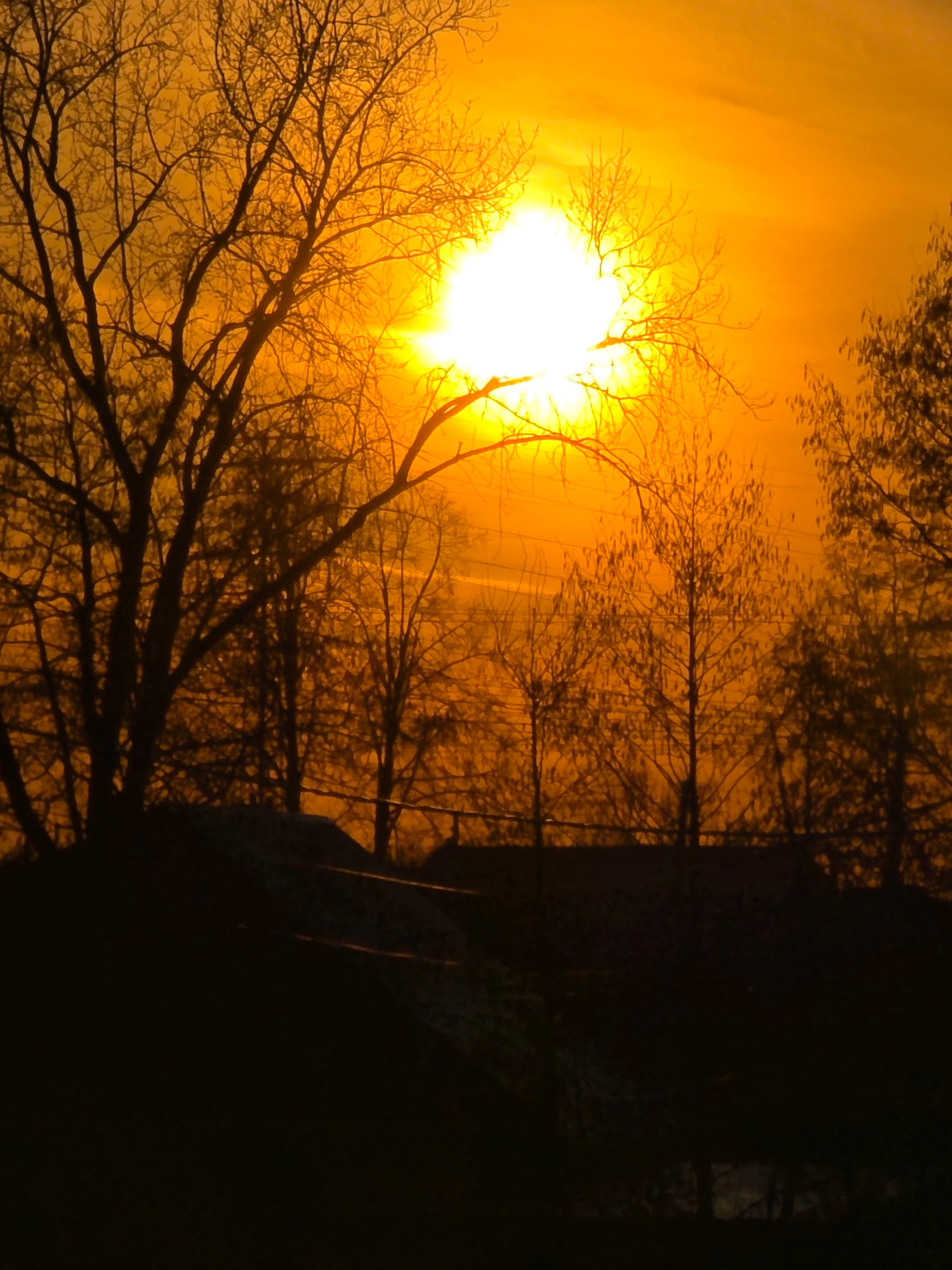 The image captures a sunrise or sunset, with the bright sun positioned behind a bare tree. The scene is awash in warm, golden light, creating a silhouette effect for the tree branches. The background…read more