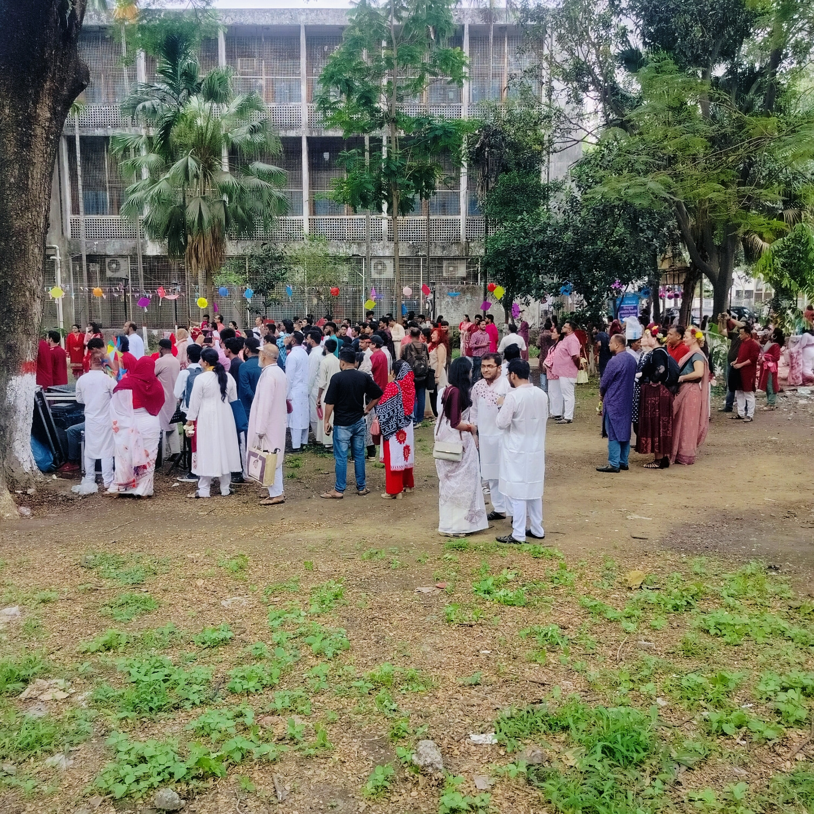 The image depicts a gathering of people on a grassy field in front of a multi-story building in Dhaka, Bangladesh. The building has a concrete facade with gridded windows and appears to be adorned wit…read more