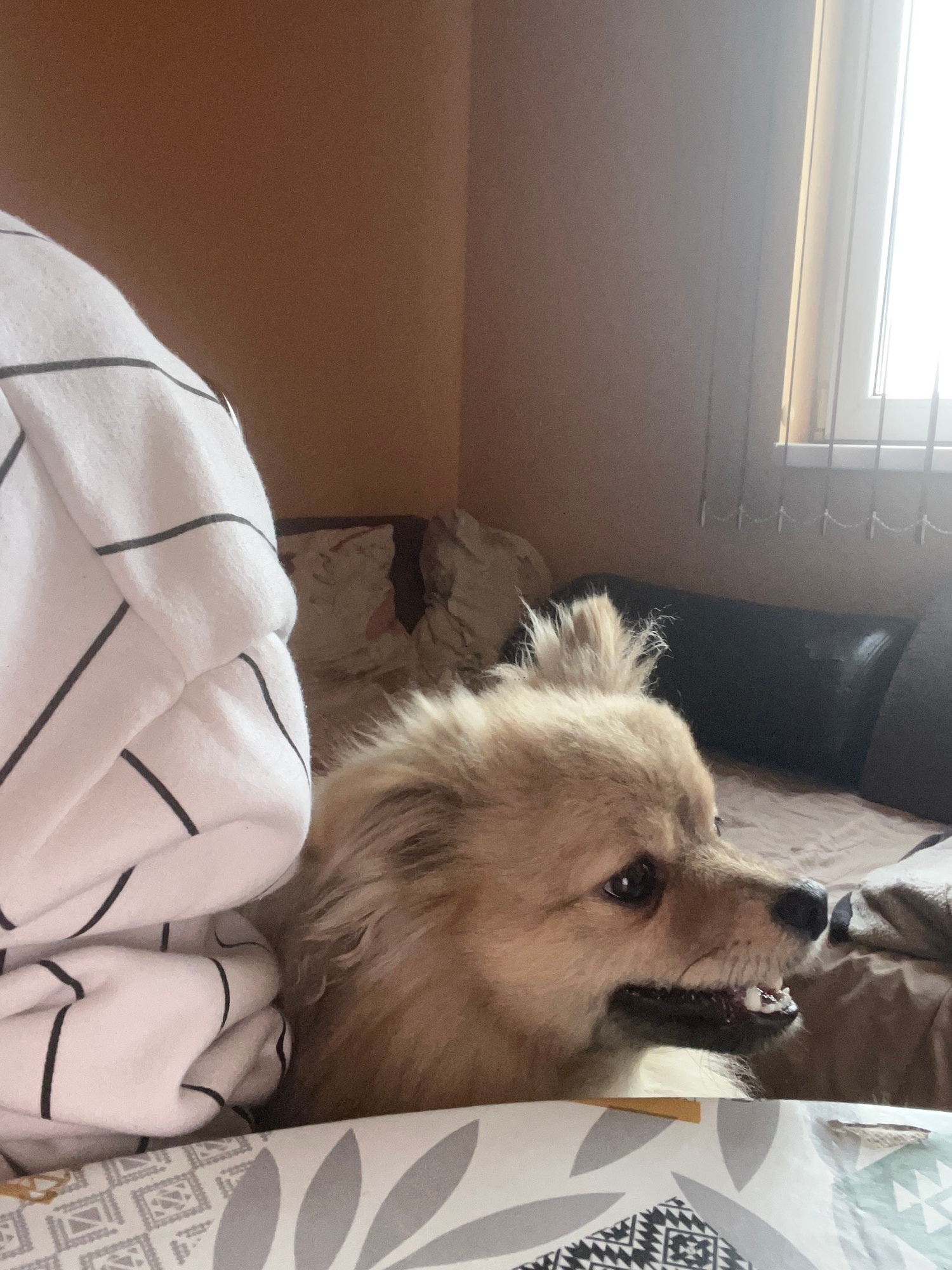 An indoor, low-angle shot captures a light-furred dog looking intently upwards and to the right. The dog, likely a medium to large breed with fluffy cream or light brown fur, has its mouth slightly ag…read more