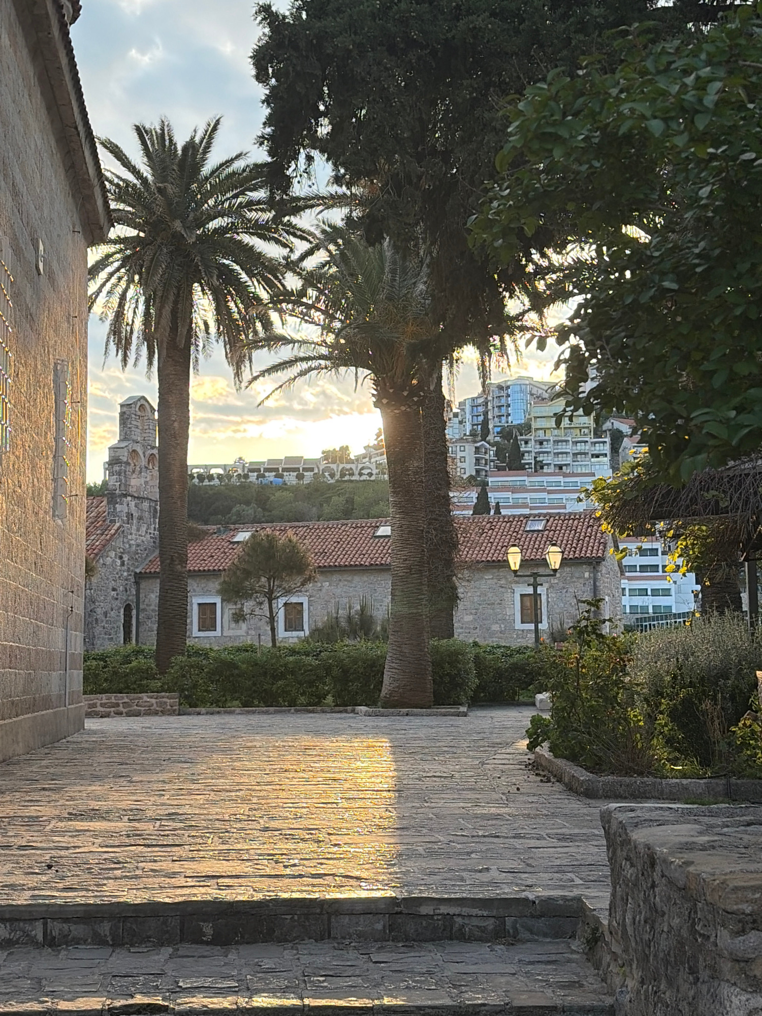 This image shows a view of Budva, Montenegro, from a higher elevation looking down a paved walkway. Palm trees frame the view. There are buildings with red-tiled roofs, modern hotels, and what appears…read more