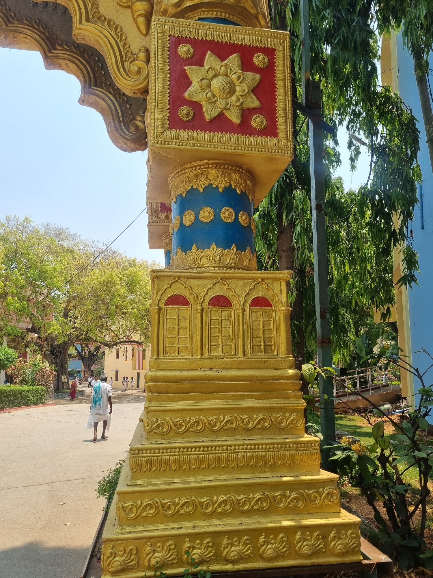 The image captures an outdoor scene in Puttaparthi, India, within a large architectural complex, likely an ashram or temple courtyard, under clear daylight. In the foreground, occupying the right sid…read more