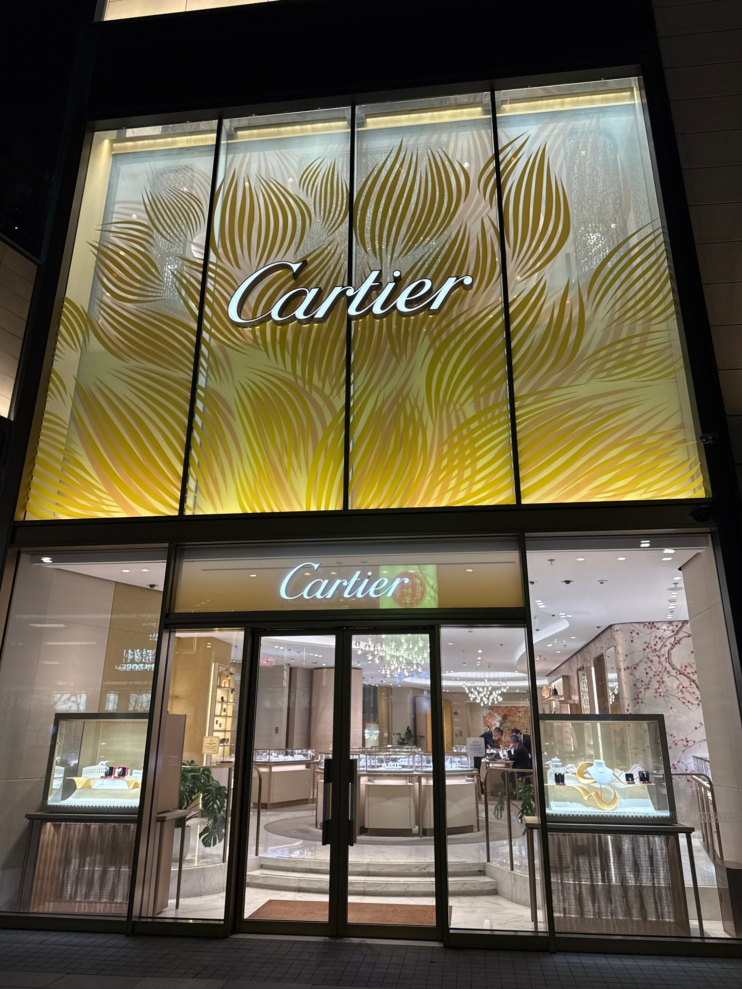 Here is a description of the image: The photograph depicts the exterior of a Cartier store at night. The store's front features large windows with the Cartier logo prominently displayed. The windows…read more