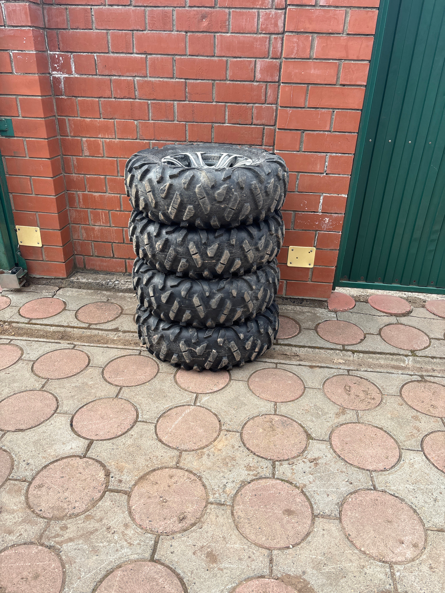 Four off-road tires are stacked against a brick wall in Ферма, Russia. The wall is made of red bricks and is partially covered by a green metal panel at the top. A yellow mounting plate is visible on…read more