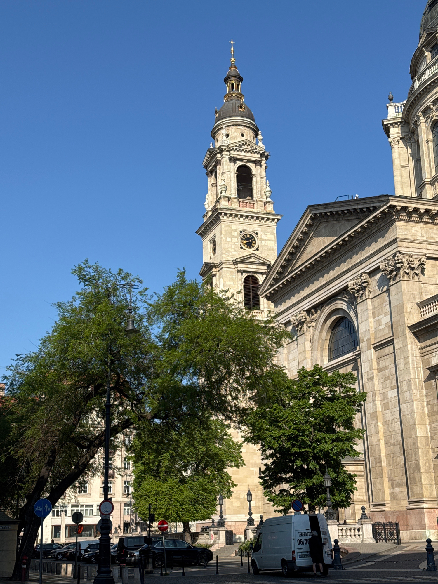 The image depicts St. Stephen's Basilica in Budapest, Hungary. The basilica's facade, dome, and clock tower are visible against a clear blue sky. Trees partially obscure the lower portion of the build…read more