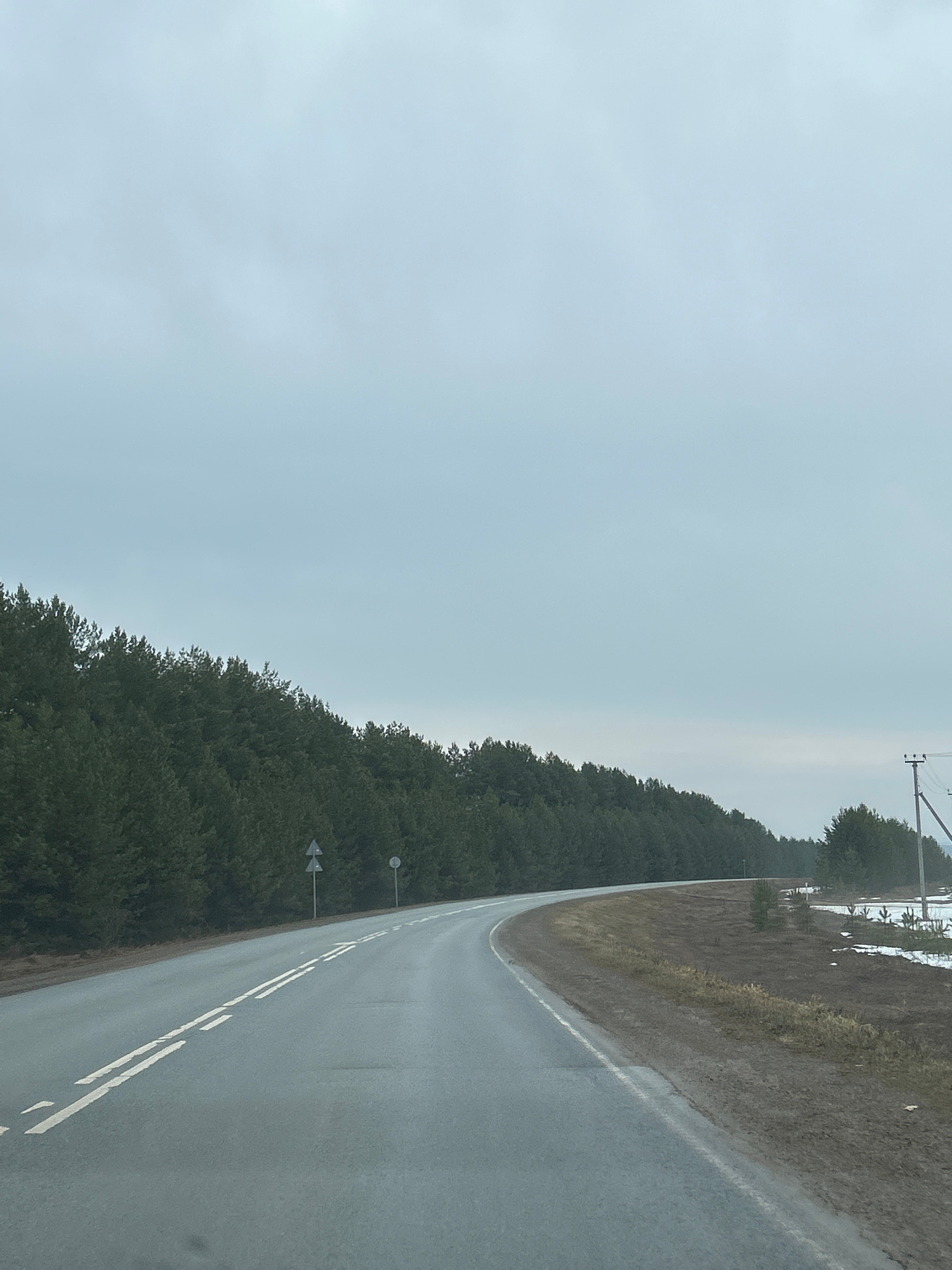 The image depicts a two-lane asphalt road with white dashed lines, curving slightly to the right. The road is bordered by a dense forest on one side and an open area on the other. The sky is overcast,…read more