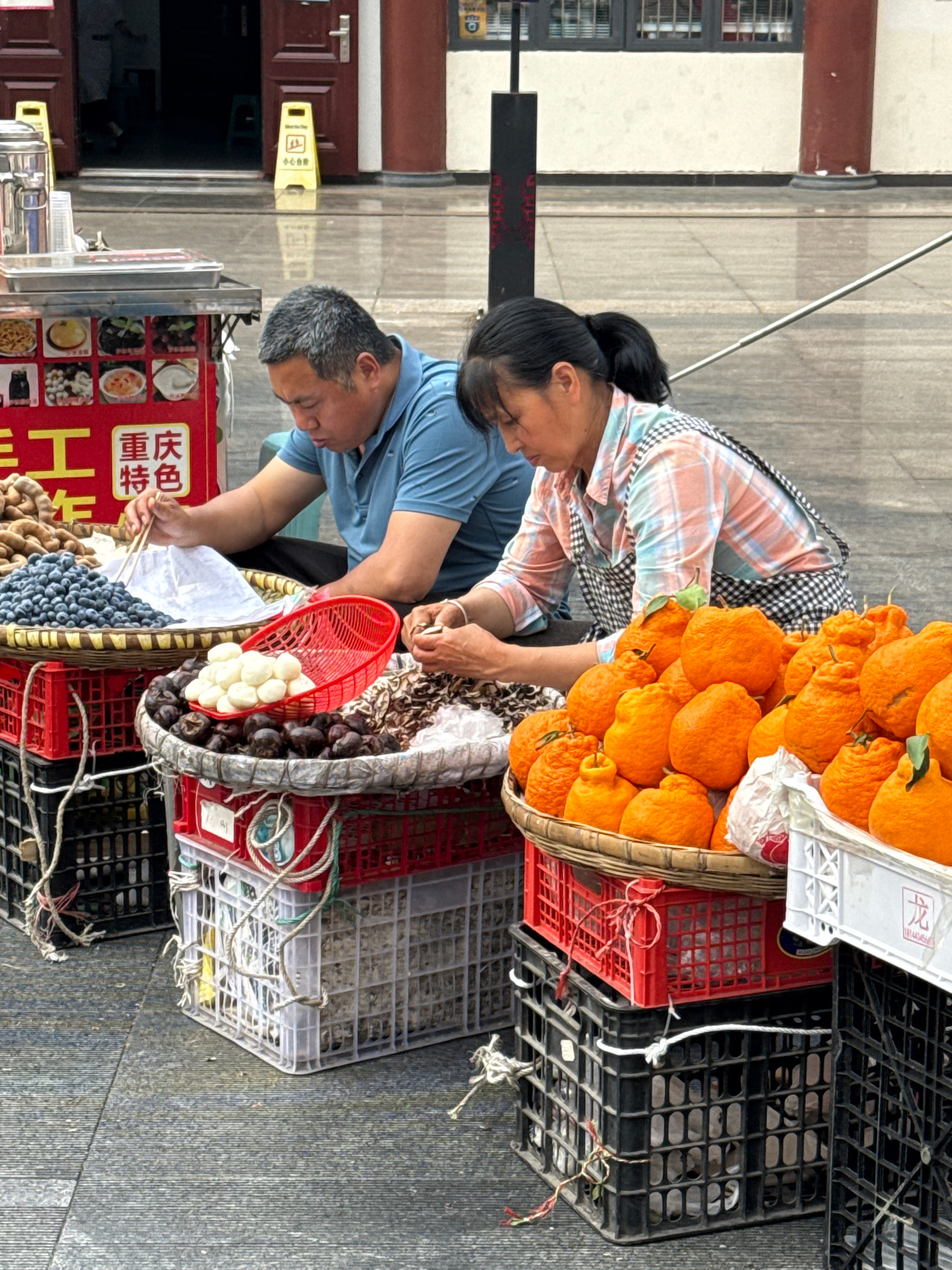 Two adults are crouched over a fruit and vegetable stand on a city street in Yuzhong District, China. The stand consists of baskets and plastic crates stacked on top of each other, displaying tangerin…read more